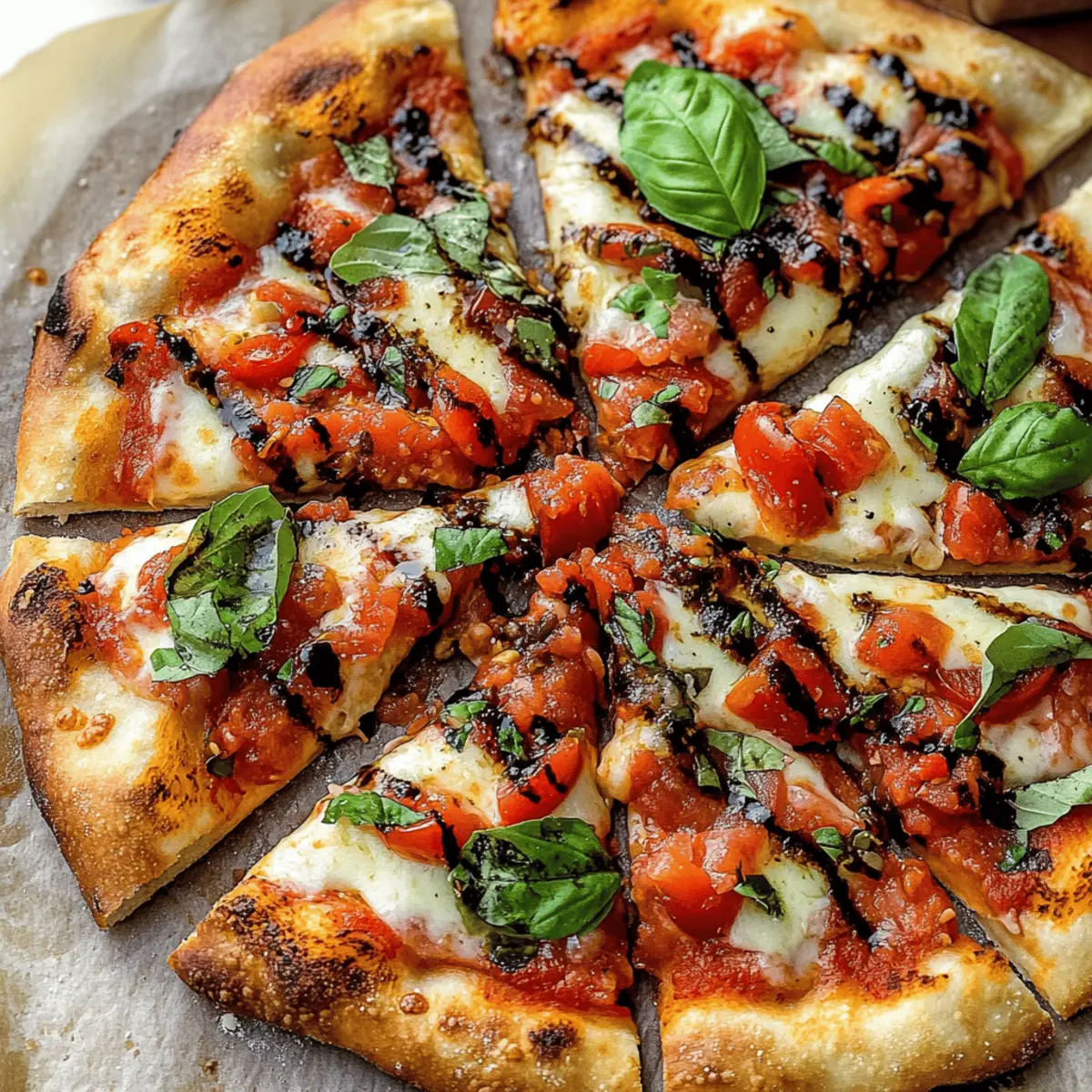 As I was fishing for dinner ideas one lazy afternoon, I stumbled upon a culinary gem that sparked my creativity: Bruschetta Pizza! This delightful twist on traditional pizza combines the vibrant flavors of garlic-infused oil, creamy mozzarella, and the rich taste of DeLallo Tomato Bruschetta—yes, it’s as amazing as it sounds! With just six simple ingredients, this homemade masterpiece is not only quick to prepare but also a family-friendly favorite, perfect for pizza night or casual celebrations. Imagine the joy of biting into a bubbly, golden crust topped with fresh basil and that irresistible tomato topping. Are you ready to elevate your pizza game? Let’s dive into this recipe together! Why Try This Bruschetta Pizza? Simplicity Abounds: With just six ingredients, this recipe is perfect for those who crave homemade goodness without the fuss. Bursting with Flavor: The garlic-infused oil paired with DeLallo Tomato Bruschetta delivers an unmatched taste experience that mere fast food can’t compete with. Crowd-Pleasing Appeal: Whether it’s a cozy family dinner or a fun get-together, this pizza is a guaranteed hit—everyone will be asking for seconds! Versatile Creation: You can customize your pie to suit your family’s preferences; add veggies or experiment with different herbs for a unique twist. Don’t forget to check out recipes like Mexican Pizza Taste for more pizza night inspiration! Bruschetta Pizza Ingredients • Elevate your pizza night with these fresh ingredients! For the Pizza Base Garlic – Enhances flavor and aroma; fresh, grated garlic is best for infusion. Extra-Virgin Olive Oil – Adds richness and is essential for making garlic oil; no substitutes recommended for optimal flavor. Fresh Pizza Dough – Forms the base of the pizza; thaw to room temperature; consider DeLallo Pizza Dough Mix for quick convenience. For the Toppings Mozzarella Cheese – Provides creaminess and melty texture; slice or tear into chunks for even coverage. DeLallo Tomato Bruschetta – A ready-made topping that bursts with flavor; essential for authentic taste. Fresh Basil Leaves – Adds a fresh, aromatic finish; substitute with oregano if basil is unavailable. DeLallo Balsamic Glaze – Drizzle for sweetness and tang; can substitute with any balsamic reduction for a similar effect. These simple yet flavorful ingredients come together to create a mouthwatering Bruschetta Pizza that will make your pizza night truly special! Step‑by‑Step Instructions for Bruschetta Pizza Step 1: Prepare Garlic Oil In a small bowl, combine freshly grated garlic with extra-virgin olive oil and a pinch of salt. Mix these ingredients thoroughly to create a fragrant garlic oil that will elevate the flavor of your Bruschetta Pizza. Let the mixture sit while you preheat your oven, allowing the garlic to infuse into the oil. Step 2: Preheat Oven Preheat your oven to a sizzling 500°F (260°C). Place your pizza stone or a baking sheet inside the oven to heat up as well. This step is crucial for achieving a perfectly crispy crust on your Bruschetta Pizza. Allow it to preheat for at least 30 minutes, ensuring it reaches optimal temperature without removing the stone. Step 3: Prepare Dough On a lightly floured piece of parchment paper, roll out the fresh pizza dough into a 12 to 14-inch round. Aim for a thickness of about 1/4 inch; it’s important to keep it even. This rolling method allows for easy transfer to the pizza stone later while maintaining a nice, thin crust for your delicious Bruschetta Pizza. Step 4: Assemble Pizza Brush the garlic oil generously over the rolled-out dough, making sure to cover the edges for a flavorful crust. Next, arrange thin slices or torn pieces of mozzarella cheese evenly across the top of the dough. This layer of cheese will melt beautifully, creating a creamy base that complements the fresh toppings. Step 5: Bake Pizza Carefully transfer your assembled Bruschetta Pizza to the preheated pizza stone or baking sheet. Bake for 10 to 14 minutes, keeping an eye on it until the crust turns golden brown and the cheese bubbles enticingly. The high heat will work its magic, delivering that irresistible crispy texture we all crave. Step 6: Add Toppings Once your pizza has reached that perfect golden state, remove it from the oven. Spoon the savory DeLallo Tomato Bruschetta generously over the top, letting its bright flavors shine. Finally, add fresh basil leaves for an aromatic finish that enhances both the appearance and taste of your Bruschetta Pizza. Step 7: Garnish & Serve Drizzle a little balsamic glaze over the finished pizza for that extra touch of sweetness and tang, just before slicing. Cut the Bruschetta Pizza into triangles and serve hot, allowing each guest to enjoy the delightful combination of flavors and textures that make this dish a true family favorite. Storage Tips for Bruschetta Pizza Fridge: Store any leftover Bruschetta Pizza in an airtight container in the refrigerator for up to 4 days. Layer slices with parchment paper to prevent sticking. Freezer: To freeze, wrap individual slices tightly in plastic wrap, then place them in a freezer bag. They can be frozen for up to 2 months. Reheating: The best way to reheat your Bruschetta Pizza is in an air fryer at 350°F for 6-8 minutes to restore crispness. Alternatively, use a skillet on medium heat with a bit of water, covered for a few more minutes. Room Temperature: If left out, consume the pizza within 2 hours to ensure food safety; any longer, and bacteria can form. Make Ahead Options These Bruschetta Pizza preparations are a lifesaver for busy weeknights! You can prep the garlic oil and pizza dough up to 24 hours in advance; simply combine the grated garlic with olive oil and refrigerate it in an airtight container. Roll out the pizza dough and keep it wrapped tightly in plastic wrap in the fridge until you’re ready to bake. When it’s time to enjoy your meal, preheat your oven, assemble the pizza with mozza