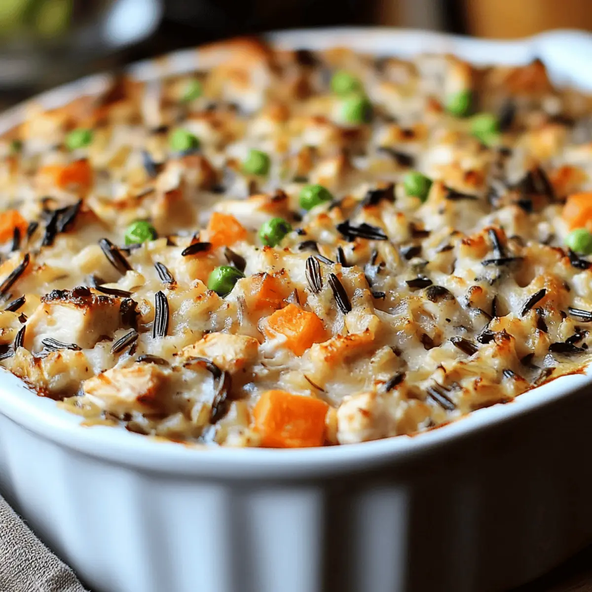 As the aroma of my bubbling Chicken Wild Rice Casserole fills the kitchen, I can’t help but feel an instant wave of nostalgia. This dish isn’t just a meal; it’s a comforting embrace on a chilly evening, combining tender chicken with nutty wild rice and a colorful medley of sautéed vegetables. One of the best things about this casserole is that it’s both kid-friendly and customizable; whether you prefer a smoky cheese twist or a veggie-packed version, it adapts to your family’s tastes effortlessly. Plus, it’s ideal for meal prep—just whip it up on a Sunday and enjoy cozy dinners throughout the week. What creative spin will you put on this timeless classic? Why is This Casserole a Must-Try? Comforting Delight: This Chicken Wild Rice Casserole is like a warm blanket on a chilly night, bringing your family together around the dinner table. Simple & Customizable: With straightforward steps and ingredients you probably already have, you can twist this dish to fit your dietary needs—try a Cheesy Chicken Spinach version or mix in seasonal veggies for an extra nutritional boost. Meal Prep Gem: It’s perfect for busy weeknights! Prepare a big batch on Sunday and savor its comforting goodness all week long. Crowd-Pleaser: Whether it’s a family gathering or cozy dinner at home, this recipe guarantees smiles and satisfied tummies. Don’t forget to pair it with a side salad for a complete meal! Chicken Wild Rice Casserole Ingredients For the Casserole Wild Rice – Provides a chewy texture and nutty flavor that enhances the dish; note: if using white or brown rice, adjust cooking time. Chicken – Main protein source that adds heartiness; use cooked or rotisserie chicken for convenience. Vegetables (onion, garlic, carrots, celery, mushrooms) – Adds flavor and nutrition; substitute based on what’s available, such as spinach or bell peppers. Butter – Adds richness and helps sauté the vegetables; can be substituted with olive oil for a healthier option. Thyme, Salt, Pepper – Essential seasonings that enhance the overall flavor profile. For the Topping Panko Breadcrumbs – Used for a crispy topping; for gluten-free, use gluten-free breadcrumbs or crushed nuts. Parmesan Cheese – Adds flavor and creaminess to the topping; other cheeses like Cheddar or Swiss are perfect for variation. Step‑by‑Step Instructions for Chicken Wild Rice Casserole Step 1: Preheat the Oven Begin by preheating your oven to 350°F (175°C). This will ensure that when your Chicken Wild Rice Casserole is ready, it will bake at the perfect temperature for that comforting golden finish. While the oven warms up, you can prepare the other components of the dish. Step 2: Cook the Wild Rice In a medium saucepan, cook the wild rice according to the package instructions, which typically takes about 45 minutes. Add a pinch of salt to the water for flavor. Once tender and the grains have split open, drain any excess water, and set the wild rice aside as it cools slightly. Step 3: Sauté the Vegetables Heat a large skillet over medium heat and melt a generous amount of butter. Add diced onion, minced garlic, chopped carrots, diced celery, and sliced mushrooms. Sauté for 5-7 minutes until the vegetables are tender and fragrant, stirring occasionally. Season with salt, pepper, and thyme to enhance the flavors, creating a savory base for your casserole. Step 4: Combine the Ingredients In a large mixing bowl, combine the cooked wild rice, sautéed vegetables, and shredded cooked chicken. Whisk together any remaining ingredients such as cream or broth, then fold them into the mixture. Ensure everything is well-blended for an even distribution of flavors in your Chicken Wild Rice Casserole. Step 5: Transfer to Baking Dish Grease a 9×13-inch baking dish with butter or cooking spray, then carefully transfer the chicken and rice mixture into the dish. Use a spatula to spread the mixture evenly, making sure to push into the corners. This creates a cohesive casserole that will bake uniformly and be easy to serve. Step 6: Prepare the Topping In a separate bowl, melt some additional butter and mix it with panko breadcrumbs and grated Parmesan cheese until combined. This topping will add a deliciously crispy finish. Sprinkle the breadcrumb mixture evenly over the casserole, ensuring every bite gets that crunchy goodness. Step 7: Bake the Casserole Place your Chicken Wild Rice Casserole in the preheated oven and bake uncovered for 30-35 minutes. Look for the topping to turn golden brown and for the casserole to bubble gently around the edges. This indicates that it’s perfectly cooked and ready to delight your family. Step 8: Let it Rest Once done, remove the casserole from the oven and let it rest for 5 minutes before serving. This brief cooling period allows the flavors to settle and makes it easier to serve your Chicken Wild Rice Casserole without it falling apart. Now, gather your loved ones and enjoy this comforting dish! Expert Tips for Chicken Wild Rice Casserole Sautéing Vegetables: Ensure you sauté the vegetables until softened; this will deepen their flavors and enhance the overall taste of your Chicken Wild Rice Casserole. Using Leftovers: If time is tight, you can use leftover chicken or rotisserie chicken for quick prep. Just ensure it’s shredded for even mixing. Make-Ahead Magic: To maximize ease, assemble your casserole up to 24 hours in advance and store it in the refrigerator; simply bake it before serving. Crispy Topping: For an extra crunchy topping, broil the casserole for a couple of minutes after baking—just keep a close eye on it to avoid burning. Ingredient Variations: Feel free to swap wild rice with brown or white rice; just remember to adjust the cooking time accordingly! Flavor Boost: Add a splash of lemon juice or a dash of hot sauce to the mixture before baking for an unexpected layer of flavor. Chicken Wild Rice Casserole Variations Feel free to mix things up and make this casserole yo