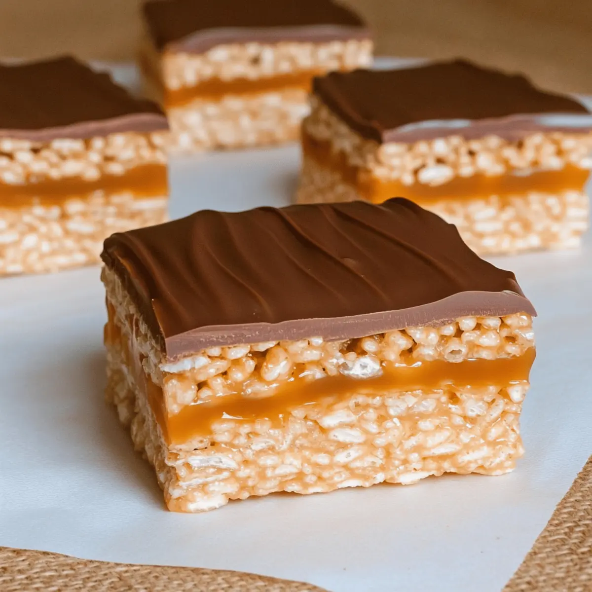 Jump to Recipe Print RecipeAs I stirred the gooey caramel and watched it blend with the melting chocolate, I couldn’t help but smile at the nostalgia flooding in. These Chocolate Caramel Rice Krispie Squares are a delightful throwback to carefree childhood days, and best of all, they’re a no-bake treat that comes together in a snap. With their chewy texture and an irresistible sweet-and-salty flavor combination, these squares are perfect for anyone ready to leave fast food behind and embrace the joy of homemade delights. Not only are they quick to prepare, but they also serve as a fantastic crowd-pleaser, whether at parties or simply as an after-school treat. Curious to bring this nostalgic goodness to your kitchen? Let’s dive in! Why are Rice Krispie Squares so irresistible? Nostalgic Treat: These Chocolate Caramel Rice Krispie Squares evoke sweet memories of childhood and celebrations, making them a beloved dessert for all ages. Quick & Easy: This no-bake recipe means you can whip them up in no time, perfect for busy days when cravings hit! Flavor Explosion: The combination of melty chocolate, gooey caramel, and crunchy Rice Krispies creates a symphony of flavors and textures that is simply irresistible. Crowd-Pleaser: Whether it’s a party or an after-school snack, these squares will disappear faster than you can say “delicious,” leaving everyone wanting more. Versatile Options: Customize them with toppings like nuts or flavored chocolate to tailor these treats to your taste preferences. For more fun variations, check out my White Chocolate Cranberry and Giant Chocolate Chip recipes! Dive into this delightful dessert and relish in every bite! Chocolate Caramel Rice Krispie Squares Ingredients For the Rice Krispie Layer • Butter – Provides richness and helps bind the marshmallows and cereal; use unsalted for better salt control. • Mini Marshmallows – Key for the gooey texture; substitute with 20 large marshmallows if needed. • Vanilla Extract – Enhances flavor; opt for pure vanilla for the best results. • Rice Krispies Cereal – Adds that signature crunch; feel free to use any puffed rice cereal you prefer. For the Caramel Layer • Caramels (about 25) – Adds sweetness and chewiness; ensure you use soft caramels or opt for caramel sauce. • Water – Essential for melting caramel smoothly; there’s no substitute for this vital ingredient. • Smooth Peanut Butter – Brings creaminess and flavor; swap with almond or sunflower seed butter for nut-free versions. For the Chocolate Topping • Milk Chocolate (8 ounces) – Provides a sweet, decadent finish; dark chocolate can be used for a richer taste. These Chocolate Caramel Rice Krispie Squares are waiting to be created, so gather your ingredients and let’s get baking! Step‑by‑Step Instructions for Chocolate Caramel Rice Krispie Squares Step 1: Prep the Baking Pan Begin by greasing a 9×9 inch baking pan with butter or lining it with parchment paper for easy removal. Ensure the entire surface is covered to prevent sticking, as this will help you lift the Chocolate Caramel Rice Krispie Squares out neatly. Set the prepared pan aside while you assemble the other ingredients. Step 2: Make the Rice Krispie Layer In a microwave-safe bowl, melt 4 tablespoons of butter on high for about 30 seconds. Add 6 cups of mini marshmallows and microwave for another 1–1.5 minutes, until the mixture is completely melted. Stir in 1 teaspoon of vanilla extract, then fold in 6 cups of Rice Krispies until fully combined. Press this mixture evenly into the bottom of the prepared pan, creating a solid base. Step 3: Prepare the Caramel Layer In a medium saucepan over medium heat, combine about 25 soft caramels and 2 tablespoons of water. Stir constantly for 5–7 minutes, allowing the caramels to melt and become smooth without burning. Once melted, mix in ½ cup of smooth peanut butter until well blended, then pour this luscious caramel over the Rice Krispie layer, spreading it to cover completely. Step 4: Create the Chocolate Layer Return to the medium saucepan and add 8 ounces of chopped milk chocolate along with ¼ cup of peanut butter. Heat gently over low heat, stirring continuously for about 3–5 minutes until the chocolate is melted and the mixture is glossy. Carefully pour the chocolate mixture over the caramel layer, using a spatula to spread it evenly for a beautifully finished top layer. Step 5: Set and Serve Refrigerate the assembled Chocolate Caramel Rice Krispie Squares for at least 1 hour, or until the chocolate is set firm to the touch. Once chilled and set, lift the squares out of the pan with the edges of the parchment (if used) and cut into squares with a sharp knife. Serve at room temperature and watch as everyone enjoys these delightful treats! Chocolate Caramel Rice Krispie Squares Variations Feel free to mix things up and make these delightful treats your own with just a few simple tweaks! Nutty Crunch: Replace some Rice Krispies with crushed nuts for added texture and protein. Chopped almonds or walnuts pair wonderfully with the chocolate and caramel layers. Flavored Chocolate: Swap out regular milk chocolate for white chocolate or even butterscotch chips. Each variation brings a unique twist, transforming the flavor profile into something new and exciting! Fruit Infusion: Stir in dried fruits like cranberries or apricots to the Rice Krispie layer before pressing it into the pan. The chewy bits of fruit add a lovely sweetness that complements the chocolate and caramel beautifully. Sugar-Free Option: Use sugar-free caramel sauce and chocolate for a lower-sugar version. This way, you can still enjoy the same rich flavors and textures without the extra sweetness. Spice it Up: Add a pinch of sea salt to the chocolate layer after melting for a delicious salty-sweet contrast. For those who love a little heat, try adding a dash of cinnamon or cayenne to the caramel! Bite-Sized Treats: Instead of preparing a 