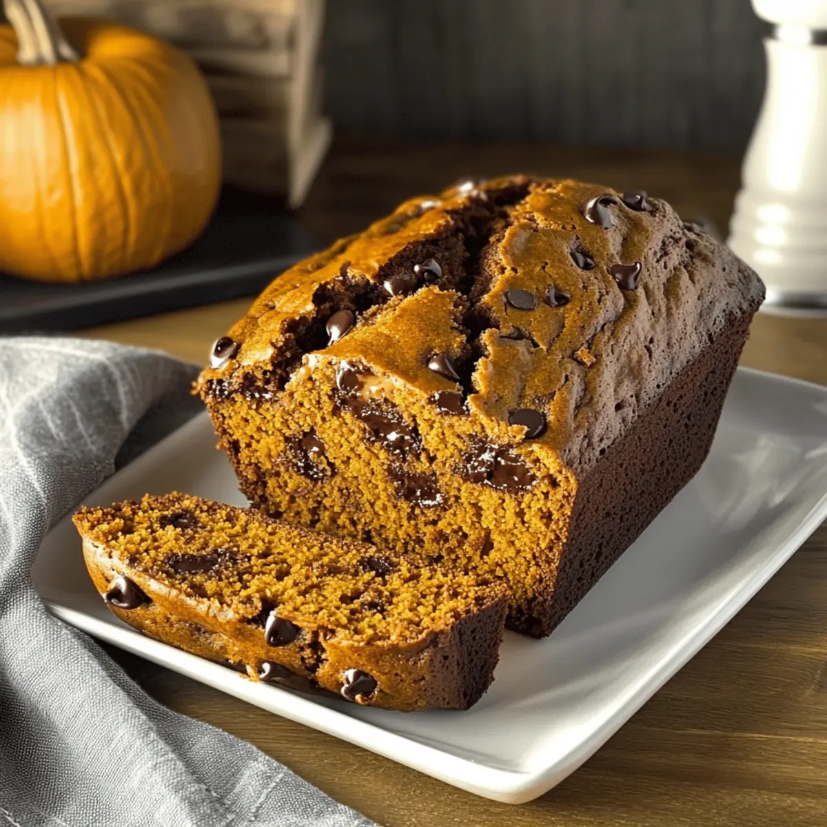 Jump to Recipe Print RecipeAs the leaves start to fall, the aroma of spiced treats fills the air, reminding us of cozy afternoons spent in the kitchen. I recently stumbled upon an incredibly simple yet delightful recipe for Chocolate Chip Pumpkin Bread that has quickly become my go-to for autumn baking. With just three ingredients, it’s not only a breeze to whip up, but it also results in an irresistibly moist and flavorful bread that perfectly captures the essence of the season. Whether you’re looking for a sweet breakfast option or a comforting dessert, this quick recipe shines—ideal for both novice bakers and seasoned pros alike! Curious to see how such simplicity can create something so indulgent? Let’s dive into this pumpkin-spiced adventure! Why is this pumpkin bread a must-try? Simplicity at Its Best: With just three ingredients, you can create an incredible treat that is both easy to make and delicious. Moist and Flavorful: The combination of pumpkin puree and chocolate chips ensures each bite is packed with moisture and richness, perfect for cozy fall days. Versatile Base: Feel free to customize your pumpkin bread! Swap in your favorite nuts or use different cake mixes for a unique twist. Crowd Pleaser: This chocolate chip pumpkin bread is sure to impress your friends and family, making it a fantastic option for gatherings or holiday parties. Quick Baking Time: With just 50-60 minutes in the oven, you’ll be enjoying a freshly baked loaf in no time! Whether it’s served warm with a pat of butter or paired with a cup of coffee, this recipe is your perfect autumn companion. Enjoy it alongside some delicious Chocolate Chip Banana bars or a slice of Giant Chocolate Chip cookie to elevate your dessert game! Ingredients for Chocolate Chip Pumpkin Bread • This delightful Chocolate Chip Pumpkin Bread requires just three ingredients to create autumnal magic! For the Batter 1 box spice cake mix – This acts as the flavorful foundation, combining several dry ingredients to simplify your baking. 1 (14 ounce) can 100% pumpkin puree – Adds essential moisture and that unmistakable pumpkin flavor; ensure it’s pure to maintain quality. 1-2 cups semi-sweet chocolate chips – Provides sweetness and richness; adjust to your taste, or try dark chocolate chips for a different twist. Get ready to enjoy a wonderfully moist treat that captures the cozy essence of fall! Step‑by‑Step Instructions for Chocolate Chip Pumpkin Bread Step 1: Preheat and Prepare Begin by preheating your oven to 350°F (175°C). While the oven warms up, take a 9×5-inch loaf pan and grease it with butter or line it with parchment paper for easy removal later. This step ensures that your Chocolate Chip Pumpkin Bread will bake evenly and release smoothly when done. Step 2: Mix Ingredients In a large mixing bowl, combine the spice cake mix and the 14-ounce can of 100% pumpkin puree. Stir the mixture together until fully blended, ensuring there are no dry pockets of cake mix. The batter will appear thick and creamy, indicating it’s ready for the next step. Step 3: Fold in Chocolate Chips Gently fold in 1 to 2 cups of semi-sweet chocolate chips into the pumpkin batter. Be careful not to overmix; just incorporate the chips until evenly distributed. The chocolate will melt into the bread as it bakes, creating delicious pockets of sweetness in your finished Chocolate Chip Pumpkin Bread. Step 4: Pour into Pan Once the chocolate chips are evenly mixed, pour the batter into your prepared loaf pan. Use a spatula to smooth the top, ensuring it spreads evenly across the surface. This will help the Chocolate Chip Pumpkin Bread rise uniformly while baking, enhancing its delightful texture. Step 5: Bake the Bread Place the loaf pan in the preheated oven and bake for 50-60 minutes. Keep an eye on it, checking for doneness by inserting a toothpick into the center. It should come out clean or with a few moist crumbs attached. If needed, rotate the pan halfway through for even baking. Step 6: Cool and Slice Allow the Chocolate Chip Pumpkin Bread to cool in the pan for about 10-15 minutes before transferring it to a wire rack. This cooling period helps set the structure of the bread. Once cooled, slice the loaf with a serrated knife, and admire your beautiful creation before serving it warm or at room temperature. How to Store and Freeze Chocolate Chip Pumpkin Bread Airtight Container: Store your Chocolate Chip Pumpkin Bread in an airtight container at room temperature for up to 3 days to maintain its moistness and freshness. Refrigerate for Longevity: If you want to keep it longer, refrigerate the bread in an airtight container for up to a week. This helps preserve flavor while keeping it moist. Freezing: For longer storage, wrap the pumpkin bread tightly in plastic wrap and then aluminum foil before freezing. It will last for up to 3 months. Reheating: To enjoy your frozen Chocolate Chip Pumpkin Bread, simply thaw it in the fridge overnight and warm slices in the microwave or oven before serving. Make Ahead Options These Chocolate Chip Pumpkin Bread are perfect for meal prep enthusiasts! You can prepare the batter up to 24 hours in advance by mixing the spice cake mix and pumpkin puree in a large bowl and refrigerating it in an airtight container. To maintain the bread’s moisture and prevent any separation, be sure to cover it well. When you’re ready to bake, simply fold in the chocolate chips and pour the batter into the prepared pan, then bake as directed. This method not only saves time but also ensures you get to enjoy a fresh loaf of warm pumpkin bread with minimal last-minute effort! Chocolate Chip Pumpkin Bread Variations Feel free to add your personal touch to this delightful pumpkin bread and make it uniquely yours! Nutty Addition: Toss in 1 cup of chopped pecans or walnuts for an extra crunch and flavor contrast. Nuts complement the soft texture beautifully, enhancing every bite! Spice It Up: Blend in a teaspoo