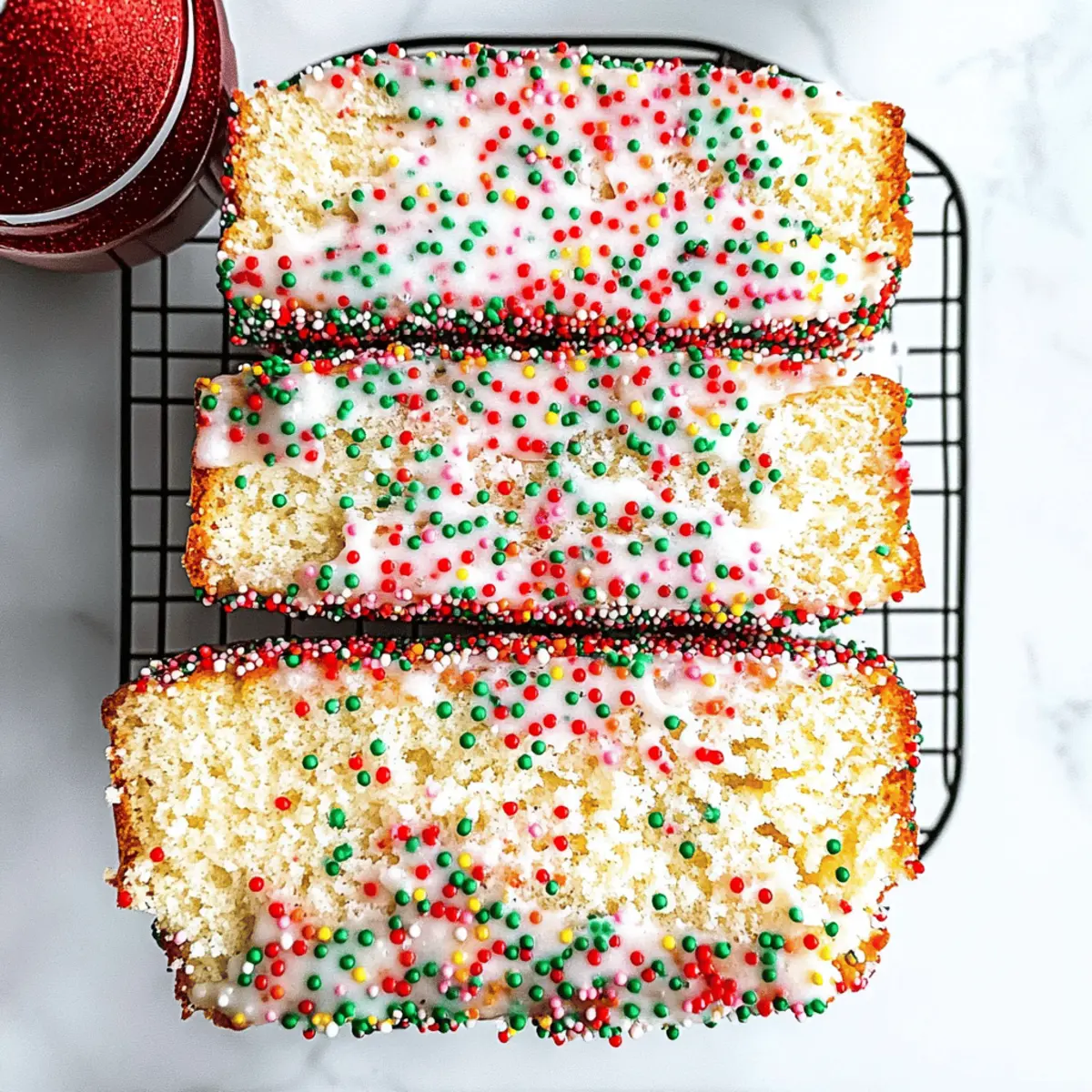 Jump to Recipe Print RecipeAs I reached for the flour, the festive spirit of the season filled my kitchen with warmth and anticipation. This Christmas Sprinkle Buttermilk Bread is not just a recipe; it’s a delightful way to embrace the cozy joy of the holidays. With its easy preparation and moist, tender crumb, this quick bread brings a colorful twist to your breakfast or brunch table. The vibrant sprinkles add a cheerful pop, making it a perfect gift for loved ones or a showstopper for holiday gatherings. Plus, it’s an excellent way to elevate your baking skills without the fuss. Are you ready to fill your home with the sweet aroma of holiday cheer and make memories that will last a lifetime? Why is This Bread So Special? Moisture and Tenderness: The buttermilk gives this bread a wonderfully moist and tender crumb, making each slice melt in your mouth. Festive Visuals: The colorful sprinkles not only add sweetness but also a joyful appearance that brings holiday cheer to your table. Quick and Easy: With minimal prep and simple ingredients, it’s perfect for those busy holiday mornings. Versatile Enjoyment: Enjoy it warm with butter, or serve as a delightful dessert with a drizzle of glaze. For those who love quick breads, check out my Cinnamon Sugar Buttermilk for another festive idea. Perfect for Gifting: Wrapped beautifully, this bread makes a charming gift for friends and family during the holiday season. Skill-Building Bakes: It’s an excellent way to hone your baking skills while creating a delightful treat that impresses every time! Christmas Sprinkle Buttermilk Bread Ingredients For the Batter • All-Purpose Flour – Forms the essential structure of the Christmas Sprinkle Buttermilk Bread, ensuring it’s light yet delightful. • Sugar – Adds sweetness and enhances the moistness of the bread for a flavorful bite. • Baking Powder – Acts as the primary leavening agent, helping the bread to rise beautifully. • Baking Soda – Provides extra lift and creates a light texture within the bread. • Kosher Salt – Balances the sweetness and intensifies the overall flavor of the loaf. • Buttermilk – Adds tenderness and a slight tang; you can substitute it with regular milk plus 1 tsp of vinegar for a similar result. • Egg – Contributes moisture and binds all the ingredients together for a perfect batter. • Unsalted Butter – Introduces richness; if you prefer, vegetable oil can be a fitting replacement. • Almond Extract – Offers a delightful hint of flavor; if you prefer, swap it with vanilla extract. • Sprinkles – These bring festive visuals and sweetness; use rod-shaped ones in the batter and round nonpareils on top to prevent bleeding. For the Glaze • Powdered Sugar – The primary ingredient for the glaze, providing a sweet and smooth finish. • Light Corn Syrup – Adds shine to your glaze; it can be omitted if you don’t mind a less glossy look, though. Now that you have all the delicious elements to create this festive treat, you’re one step closer to baking a scrumptious loaf of Christmas Sprinkle Buttermilk Bread. Enjoy the cheerful spirit it brings to your kitchen! Step‑by‑Step Instructions for Christmas Sprinkle Buttermilk Bread Step 1: Preheat the Oven Begin by preheating your oven to 350°F (175°C) and positioning the rack in the upper third. This temperature ensures an even baking process, allowing your Christmas Sprinkle Buttermilk Bread to rise beautifully. While the oven warms up, gather your ingredients and prepare your work area for a delightful baking experience. Step 2: Prepare the Loaf Pan Line a 9×5 inch loaf pan with parchment paper, leaving some overhang to make it easier to lift the bread out later. This preparation helps prevent sticking, ensuring that your Christmas Sprinkle Buttermilk Bread comes out intact and maintains its lovely shape. Lightly grease the edges of the pan for added insurance against sticking. Step 3: Mix the Dry Ingredients In a large mixing bowl, whisk together the all-purpose flour, sugar, baking powder, baking soda, and kosher salt until combined and no lumps remain. This step is crucial for an even texture in your Christmas Sprinkle Buttermilk Bread. The dry mixture should be light and fluffy, ready to blend with the wet ingredients for optimal rise and flavor. Step 4: Combine the Wet Ingredients In a separate bowl, mix the egg, buttermilk, melted butter, and almond extract until smooth. Ensure that your buttermilk is at room temperature for the best results. This mixture adds the wonderful moisture to the Christmas Sprinkle Buttermilk Bread, making each slice delightful. Stir until fully combined for a harmonious blend of flavors. Step 5: Combine Wet and Dry Mixtures Pour the wet ingredients into the bowl with the dry mixture. Gently stir until just combined; be careful not to overmix, as this can lead to a dense bread. As you fold in the mixture, incorporate the colorful sprinkles, ensuring they’re evenly distributed without bleeding into the batter. Step 6: Bake the Bread Pour the batter into the prepared loaf pan and spread it evenly. Place the pan in the preheated oven and bake for 45-50 minutes. The Christmas Sprinkle Buttermilk Bread is done when the center is set, and a toothpick inserted comes out clean. Keep an eye on it in the final minutes to achieve that perfect golden brown. Step 7: Cool the Bread Once baked, let the bread cool in the pan for about 5 minutes. Afterward, carefully lift it out using the parchment paper and transfer it to a wire rack. Allow the Christmas Sprinkle Buttermilk Bread to cool completely, which may take 1-2 hours. This cooling period lets the flavors meld beautifully while also ensuring a perfect texture. Step 8: Prepare the Glaze To create the glaze, whisk together the powdered sugar, buttermilk, and light corn syrup in a small bowl until you reach your desired consistency. Once your bread is completely cooled, drizzle this sweet glaze over the top