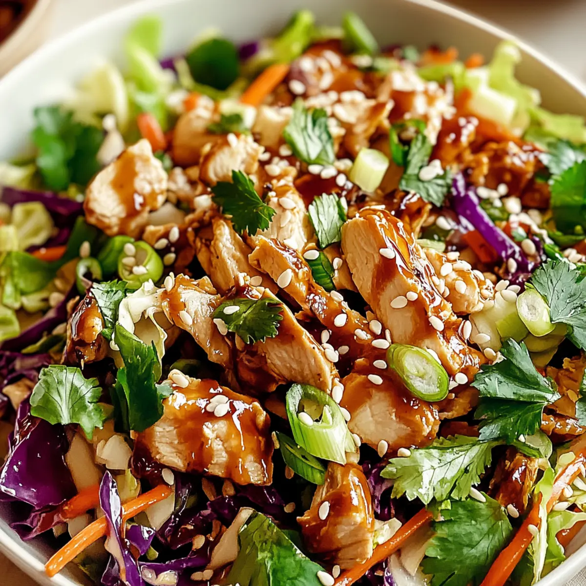 As I was tossing together the vibrant colors for dinner, a satisfying crunch echoed in the kitchen, drawing my attention. The star of the show? My Crunchy Sesame Chicken Cabbage Salad, a symphony of tender chicken and crisp vegetables dressed in a tangy sesame sauce. It’s the perfect solution for anyone needing a quick yet delightful meal—ready in just 30 minutes! This salad doesn’t just fill you up; it serves as a cheerful centerpiece for any table, making it both a go-to for lunch and a standout option for lighter dinners. Whether you’re catering to a gluten-free diet or simply seeking a refreshing meal that leaves you energized, this salad checks all the boxes. Curious how to whip up this deliciousness in your own kitchen? Let’s dive into the recipe! Why is This Salad a Must-Try? Quick Prep Time: In just 30 minutes, you can create this stunning salad, perfect for busy weeknights or spontaneous lunch gatherings. Flavor Explosion: The tangy sesame dressing harmonizes with the crunch of fresh veggies, offering a delightful mix of flavors that will tantalize your taste buds. Healthy and Satisfying: Packed with protein and fiber, this salad is not just light—it’s nourishing and will keep you feeling full longer. Versatile: Customize your bowl by swapping in kale or adding sliced almonds for extra crunch; this recipe adapts to your preferences! Crowd-Pleaser: Whether you’re serving family or hosting friends, this vibrant dish is sure to impress without spending hours in the kitchen. Don’t forget to pair it with your favorite grilled meats for a complete meal! You might also enjoy this Cucumber Chicken Salad or the delightful Balsamic Glazed Chicken for extra variety. Crunchy Sesame Chicken Cabbage Salad Ingredients For the Chicken Chicken Breast – Provides protein and substance to the salad; marinate in sesame oil and soy sauce for enhanced flavor. For the Salad Base Cabbage – Acts as a crunchy base; can be substituted with kale for variety. Carrots – Adds sweetness and vibrant color; shred thinly for better blending in the salad. Green Onions – Offers a mild onion flavor; can be substituted with chives for a change of taste. For the Dressing Soy Sauce – Provides umami and saltiness; use gluten-free soy sauce for a gluten-free option. Sesame Oil – Adds a rich, nutty flavor; can be replaced with olive or peanut oil if preferred. Rice Vinegar – Contributes a tangy element to the dressing; lemon juice can be used for a different flavor profile. Honey – Balances the dressing with sweetness; sugar or agave syrup are great alternatives. For Garnishing Toasted Sesame Seeds – Adds crunch and a nutty flavor, perfect for topping this salad. Fresh Cilantro – Enhances the freshness of the dish; can be omitted if cilantro isn’t a favorite. This Crunchy Sesame Chicken Cabbage Salad is not only a feast for the senses but also a quick and healthy delight! Step‑by‑Step Instructions for Crunchy Sesame Chicken Cabbage Salad Step 1: Cook the Chicken Heat a skillet over medium heat, adding a drizzle of oil. Season your chicken breast with salt and pepper, ensuring an even coating. Once the oil is shimmering, place the chicken in the skillet and cook for about 6–7 minutes on each side. Look for a golden-brown crust and ensure the chicken is cooked through to 165°F (75°C) for perfectly juicy meat. Step 2: Prepare the Dressing In a small mixing bowl, whisk together soy sauce, rice vinegar, sesame oil, and honey until well combined. Taste the dressing, adjusting the sweetness or saltiness to balance out the flavors as desired. This tangy mixture will elevate the Crunchy Sesame Chicken Cabbage Salad, making it an irresistible topping for the veggies. Step 3: Chop Veggies While the chicken is cooking, take a sharp knife and chop the cabbage into bite-sized pieces, ensuring a crunchy base for your salad. Shred the carrots thinly for added sweetness and color. Set the prepared vegetables aside, allowing their vibrant colors to shine through as they will create a stunning visual appeal in the salad. Step 4: Combine Ingredients After the chicken has rested for a few minutes, slice it into strips. In a large mixing bowl, combine the chopped cabbage, shredded carrots, chopped green onions, and the sliced chicken. Gently fold the ingredients together to ensure an even distribution for your Crunchy Sesame Chicken Cabbage Salad. Step 5: Dress the Salad Drizzle your prepared dressing over the salad mixture, making sure to coat everything evenly. Toss gently until all the ingredients are beautifully combined and covered in the tangy sauce. The vibrant colors of the veggies will pop and create an eye-catching presentation for your salad. Step 6: Garnish Finally, sprinkle toasted sesame seeds and fresh cilantro over the top of your salad for added texture and flavor. Toss gently to incorporate these garnishes without losing the crispness of the veggies. Serving your Crunchy Sesame Chicken Cabbage Salad fresh will ensure every bite is a delightful crunch filled with flavor. Crunchy Sesame Chicken Cabbage Salad Variations Feel free to explore the creative possibilities to make this salad uniquely yours—it’s a fun journey for your taste buds! Kale Swap: Replace cabbage with kale for a heartier texture and added nutrients; it offers a delicious twist! Nutty Addition: Toss in sliced almonds or peanuts for that extra crunch; they add wonderful flavor contrasts to the salad. Spice it Up: For those who like a kick, add sliced jalapeños or a dash of Sriracha to the dressing; it transforms the flavor profile beautifully! Sweet Adjustment: Switch honey for agave syrup if you’re looking for a different kind of sweetness; it creates a uniquely light taste. Herb Boost: Consider adding fresh mint or basil alongside cilantro; they enhance the freshness with aromatic notes in every bite. Fruit Infusion: Mix in some diced mango or pineapple; the sweetness pairs wonderfully with the savory dres
