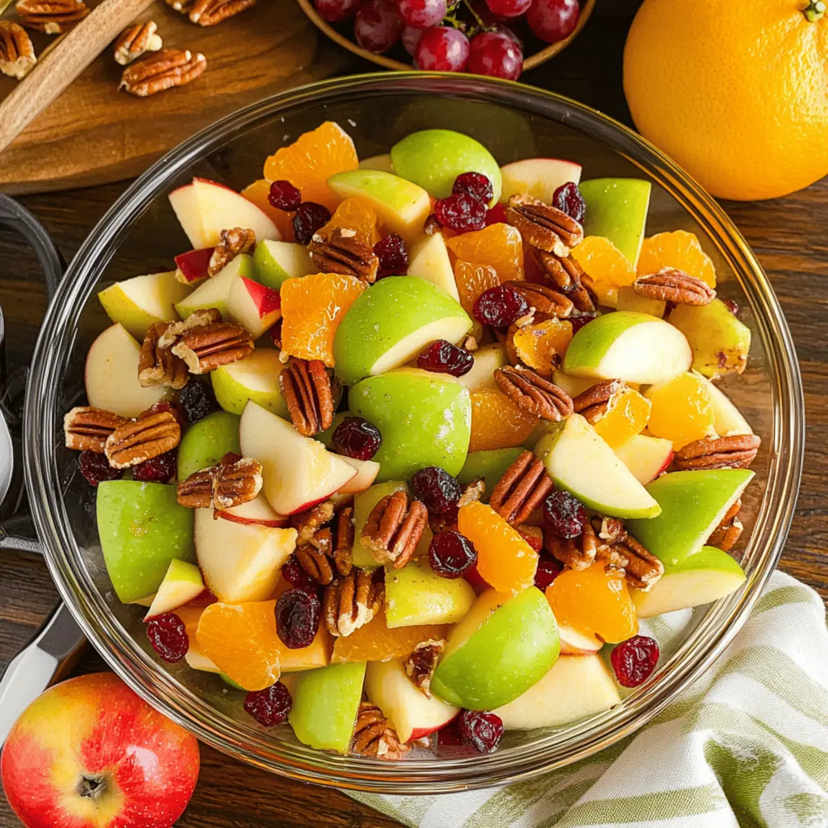 Jump to Recipe Print RecipeAs I was sorting through my favorite seasonal recipes, I stumbled upon a vibrant blend of colors that instantly transported me to beautiful family gatherings—this Colorful Thanksgiving Fruit Salad with Spiced Citrus Dressing. It’s amazing how a mix of crunchy apples, sweet grapes, and tangy oranges can create such a refreshing experience, especially when drizzled with a homemade dressing that dances with warm spices. Not only is this fall fruit salad perfect for Thanksgiving and Christmas feasts, but it also takes just 10 minutes to prepare! Imagine impressing your guests with a light, healthy side dish that doubles as a delicious dessert when paired with a scoop of ice cream. Intrigued? Let’s dive into how you can create this festive delight in no time! Why is This Fruit Salad a Must-Try? Simplicity Meets Elegance: With just a quick 10-minute prep time, this fruit salad is perfect for busy holiday schedules. Bursting with Flavor: The spiced citrus dressing elevates the fresh fruits, creating a delightful balance that’s truly irresistible. Versatile Delight: Great as a side dish for holiday dinners or a light dessert, it easily adapts to any occasion. Colorful Presentation: Vibrant hues of red apples, green apples, and oranges make it a visually stunning centerpiece for your table. Healthy Indulgence: Packed with vitamins and fiber, you can enjoy this guilt-free treat while impressing your health-conscious guests. Looking for another refreshing side? Check out my easy Broccoli Cauliflower Salad for a perfect pairing! Fall Fruit Salad Ingredients • Let’s gather what you need for this Fall Fruit Salad for Thanksgiving and Christmas! For the Fruit Green Apples – Provides crunch and tartness; substitute with Granny Smith or other tart varieties for extra zing. Red Apples – Adds sweetness and color; alternatives like Fuji or Honeycrisp offer similar results. Dried Cranberries – Offers sweetness and a chewy texture; feel free to swap with raisins or chopped dates if desired. Pecans – Adds a nutty crunch; can be replaced with walnuts or almonds to suit your taste. Grapes – Contributes juiciness and sweetness; any type of seedless grapes will work perfectly. Navel Oranges – Provides tanginess and juiciness; mandarins or tangerines are great substitutes. For the Dressing Lemon (Juiced) – Prevents browning of apples and adds acidity; use lime juice if lemon is unavailable. Orange Juice – Acts as a sweet base for the dressing; freshly squeezed is ideal, but bottled can do in a pinch. White Sugar – Sweetens the dressing; opt for honey or agave syrup for a less refined choice. Apple Pie Spice – Adds warmth and flavor; a mix of cinnamon and nutmeg can be used as a replacement. Lemon Zest – Enhances the citrus flavor; always use fresh zest for the best results. Orange Zest – Complements the orange juice for a more intense flavor; fresh zest is highly recommended. Step‑by‑Step Instructions for Fall Fruit Salad For Thanksgiving And Christmas Step 1: Preheat the Oven Begin by preheating your oven to 350°F (175°C). Spread out the pecans on a baking sheet in an even layer. Toast them in the oven for about 5 to 10 minutes, until they become fragrant and slightly golden. Keep a close eye on them to avoid burning. Once toasted, remove them from the oven and allow them to cool completely. Step 2: Prepare the Dressing In a small saucepan, combine the freshly squeezed orange juice, white sugar, apple pie spice, lemon zest, and orange zest. Heat the mixture over medium heat, whisking continuously until it reaches a gentle boil. Once boiling, reduce the heat and let it simmer for about 3 to 4 minutes until slightly thickened. Afterward, strain the mixture to remove any zest pieces and set it aside to cool. Step 3: Cut the Fruit While the dressing is cooling, take the green and red apples and core them. Slice the apples into bite-sized pieces and toss them immediately with lemon juice to keep them from browning. Then, peel the navel oranges and segment them into small, juicy pieces. This combination of fruits will add a colorful and refreshing element to your Fall Fruit Salad for Thanksgiving and Christmas. Step 4: Mix the Salad In a large mixing bowl, combine the chopped apples, your choice of grapes, orange segments, dried cranberries, and the toasted pecans. Stir gently to ensure everything mixes evenly without bruising the fruits. This balanced combination creates a delightful array of textures and flavors that make this salad truly seasonal. Step 5: Serve the Salad Once the dressing has cooled completely, drizzle it over the fruit mixture in the bowl. Toss everything together gently until the fruits are well coated, enhancing the natural sweetness in your Fall Fruit Salad for Thanksgiving and Christmas. Serve immediately for the freshest taste, and enjoy the vibrant and festive look of your dish! Make Ahead Options These Colorful Thanksgiving Fruit Salad and Spiced Citrus Dressing are perfect for busy home cooks looking to save time during the hectic holiday season! You can make the dressing up to 3 days in advance; simply refrigerate it in an airtight container. Additionally, toast your pecans up to 1 week ahead to ensure they maintain their crunch. For the fruit, it’s best to prep the apples and toss them with lemon juice before storing in the fridge for up to 1-2 days, but keep in mind they may brown slightly. When ready to serve, combine everything in a bowl, drizzle with the dressing, and toss gently for fresh, festive results that are just as delicious! Expert Tips for Fall Fruit Salad Choose Fresh Fruits: Select ripe, seasonal fruits for the best flavor. Fresh apples, oranges, and grapes make your Fall Fruit Salad extra delightful. Prevent Browning: Toss cut apples with lemon juice immediately to keep them vibrant and appealing. This simple step enhances your salad’s appearance. Adjust the Sweetness: Taste the dressing before servin