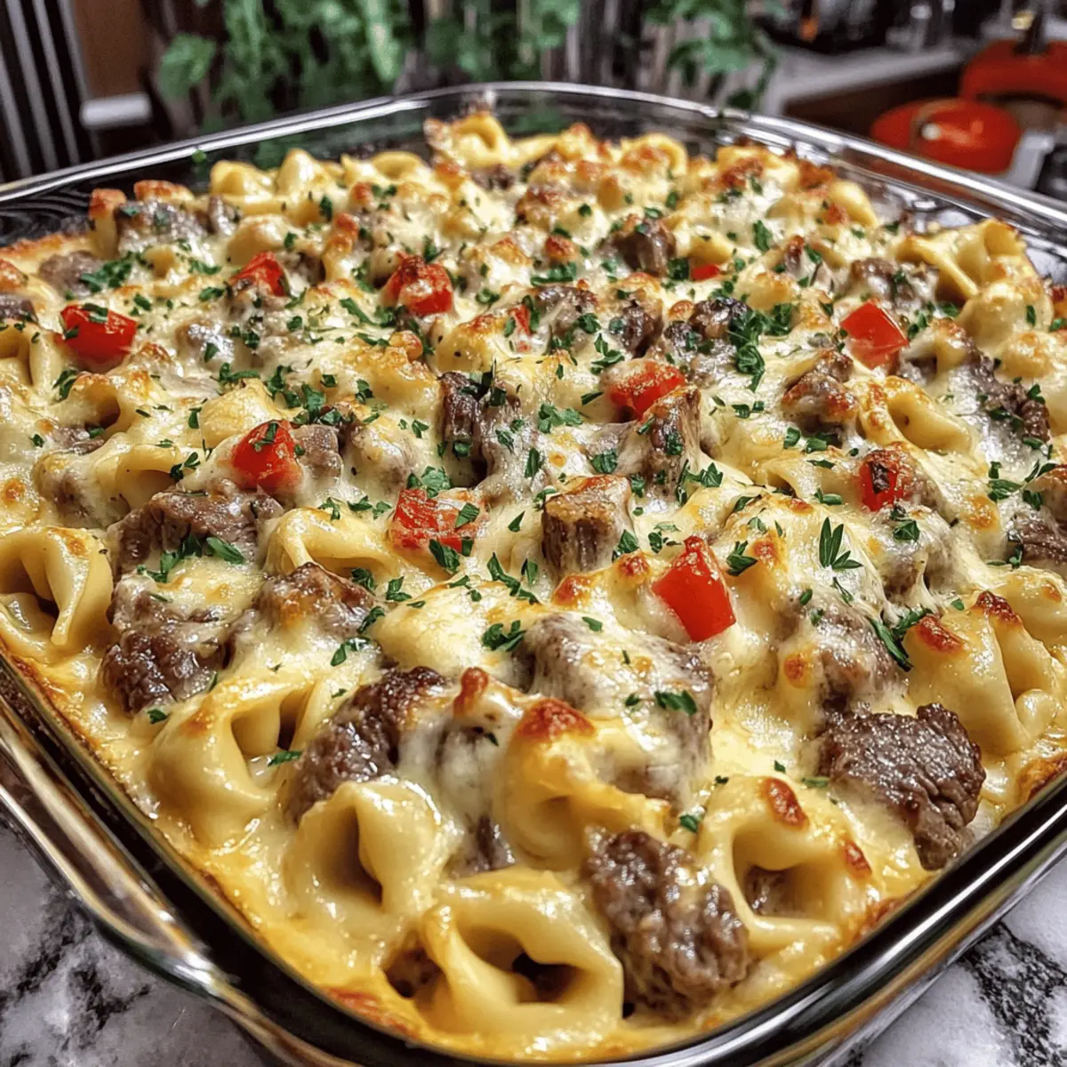 As the aroma of sizzling steak and melting cheese wafts through my kitchen, I can’t help but feel a bubbling excitement for tonight’s dinner. This Golden Cheese Steak Tortellini Casserole is not just a meal; it’s a comforting hug on a plate that the whole family will adore. With tender steak and pillowy tortellini swimming in a creamy, golden sauce, this dish combines the best of indulgent flavors and wholesome ingredients. One of the beauties of this casserole is how quick it comes together—perfect for those busy weeknights—or how it can be prepped in advance for gatherings. Plus, it’s incredibly customizable; whether you prefer swapping meats or experimenting with different cheeses, the possibilities are endless! Are you ready to dive into a world of cheesy goodness? Let me guide you through this irresistible recipe! Why is this casserole a must-try? Comforting, Creamy Delight: This Golden Cheese Steak Tortellini Casserole is a warm embrace on a chilly evening, combining tender steak and dreamy cheese sauce that melts in your mouth. Quick Prep Time: With straightforward steps and simple ingredients, dinner is ready in no time—ideal for hectic weeknights! Customizable Options: Feel free to swap out proteins or experiment with cheese varieties to suit your taste buds. Perfect Meal Prep: Assemble it in advance and refrigerate, making it a breeze to bake when you’re short on time. Crowd-Pleasing Flavor: Serve this dish at gatherings, and you’re guaranteed to impress your family and friends! You can also pair it with a fresh green salad or some delicious garlic bread for an unbeatable meal. Golden Cheese Steak Tortellini Casserole Ingredients Experience the rich flavors that make this dish irresistible! For the Casserole Sirloin Steak – Provides protein and hearty flavor; substitute with chicken or ground meat if preferred. Salt & Black Pepper – Enhance the seasoning of the steak and overall dish; adjust to your personal taste. Olive Oil – Used for searing the steak; can be replaced with vegetable oil for a neutral flavor. Butter – Adds richness to the cheese sauce; margarine is a suitable substitute if needed. Garlic – Offers aromatic depth; fresh garlic provides the best flavor. All-Purpose Flour – Thickens the cheese sauce for a velvety texture; cornstarch works for a gluten-free option. Milk (Whole or 2%) – Creates the creamy base for the sauce; non-dairy milk is an excellent alternative. Beef Broth – Adds depth; vegetable broth is a great vegetarian substitute. Cheddar Cheese – Provides rich flavor; consider Gruyère or Italian cheese blends for variety. Dijon Mustard (optional) – Introduces a tangy depth to the sauce; omit if you prefer a milder flavor. Paprika – Adds subtle spice and color; smoked paprika can deliver an extra layer of flavor. Cheese Tortellini – Serves as a comforting base; both fresh and frozen options will work wonderfully. Mozzarella (for topping) – Melts beautifully, creating a golden crust; feel free to blend different cheeses here. Chopped Parsley (for garnish) – Brightens the dish with color and flavor; fresh basil or dill can be used instead. Let this delightful Golden Cheese Steak Tortellini Casserole bring warmth and joy to your table! Step‑by‑Step Instructions for Golden Cheese Steak Tortellini Casserole Step 1: Preheat and Season Begin by preheating your oven to 375°F (190°C). While it heats, season your sirloin steak generously with salt and black pepper. Make sure to coat both sides evenly for the best flavor. This is an essential step to enhance the taste of your Golden Cheese Steak Tortellini Casserole. Step 2: Sear the Steak In a large skillet, heat 2 tablespoons of olive oil over medium-high heat. Once the oil shimmers, add the seasoned steak and sear for 2–3 minutes on each side, until browned and cooked to your preference. The steak should be juicy and slightly caramelized. Remove it from the skillet and set aside to rest while you prepare the sauce. Step 3: Make the Roux In the same skillet, lower the heat to medium, and add 3 tablespoons of butter. Allow it to melt completely, then add minced garlic, sautéing for about 30 seconds until fragrant. Stir in ¼ cup of all-purpose flour and cook for 1 minute, stirring constantly to form a roux that will thicken your cheese sauce for the Golden Cheese Steak Tortellini Casserole. Step 4: Create the Cheese Sauce Gradually whisk in 2 cups of milk and 1 cup of beef broth, ensuring there are no lumps. Continue to stir regularly, bringing the mixture to a gentle simmer. Once it’s thick and creamy, add 2 cups of shredded cheddar cheese, Dijon mustard, and 1 teaspoon of paprika, stirring until fully melted and smooth. This velvety sauce brings richness to your casserole. Step 5: Prepare the Tortellini While the sauce is thickening, cook your cheese tortellini according to the package instructions, but slightly undercook them for just about 1 minute. Drain the tortellini and toss them with a drizzle of olive oil to prevent sticking. This step ensures that your tortellini retains their tender texture in the Golden Cheese Steak Tortellini Casserole. Step 6: Combine Ingredients In a greased 9×13 baking dish, combine the cooked tortellini, seared steak cut into bite-sized pieces, and the creamy cheese sauce. Gently mix everything together until well-coated, ensuring that the steak and tortellini are evenly distributed throughout the dish. This step sets the foundation for a delicious casserole. Step 7: Add the Topping Sprinkle 1 to 1.5 cups of shredded mozzarella cheese evenly over the top of the casserole. Make sure to cover all areas so every bite has a cheesy topping. This creates a beautiful, golden crust when baked. Step 8: Bake Place the baking dish in the preheated oven and bake uncovered for 20–25 minutes, or until the cheese is bubbly and lightly golden. Keep an eye on it, as the golden color is a sure sign that your Golden Cheese Steak Tortellini