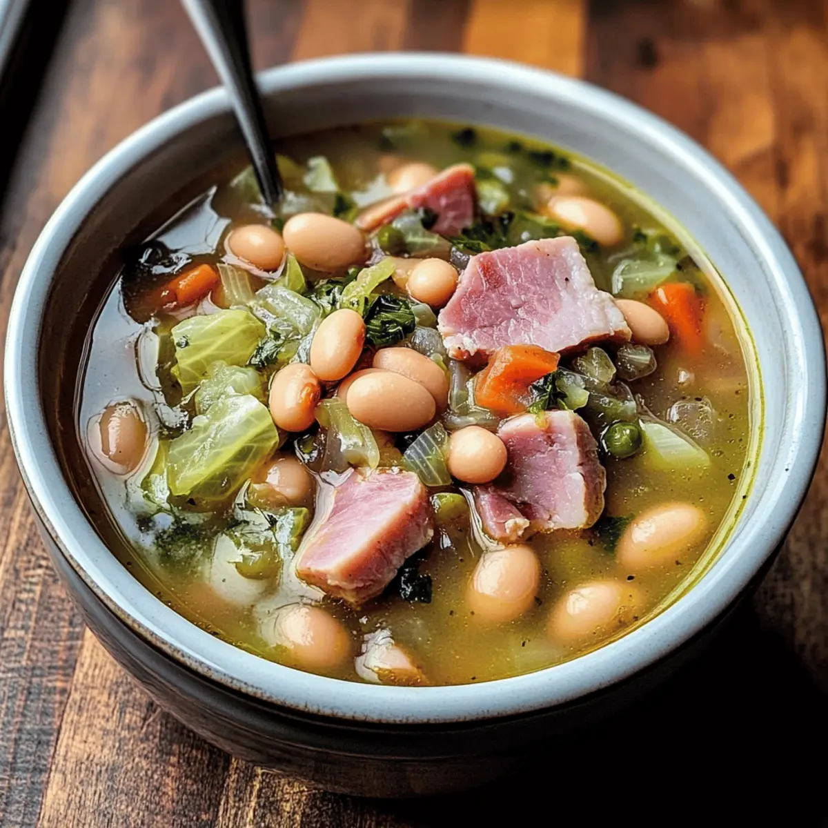 As the crisp air settles in and the leaves begin to turn, I find myself drawn to the kitchen, craving something warm and nourishing. Enter Smoked Ham Hock and Bean Cabbage Soup—a traditional French Garbure that not only fills the belly but also envelops the senses in a delightful smoky embrace. This hearty comfort food is packed with protein and fiber, making it an ideal choice for those chilly evenings when you want a meal that truly satisfies. The rich combination of tender ham, creamy white beans, and a colorful array of vegetables creates a blend of flavors that’s as comforting as a hug after a long day. Curious to learn the secrets of making this wholesome dish? Let’s dive in and discover the magic of this slow-cooked treasure! Why Is This Soup So Nourishing? Comforting warmth: This Smoked Ham Hock and Bean Cabbage Soup is the ultimate winter warmer, providing a cozy meal that wraps you in its embrace with every spoonful. Rich, hearty texture: The combination of tender ham, creamy beans, and robust vegetables creates a deliciously satisfying dish that’s reminiscent of a warm, hearty stew. Flavorful depth: Slow-cooked to perfection, the infusion of savory herbs enhances the rich flavors, ensuring every bite delights your taste buds and warms your soul. Versatile ingredients: Feel free to substitute different beans or greens. Swap in chickpeas or kale for a personalized twist! Easy to prepare: Perfect for busy weeknights, this soup mostly cooks itself. Let it simmer while you enjoy a glass of wine or prep a salad! You can even pair it with a delicious side like Parmesan Green Beans for a complete meal. Crowd-pleaser: Whether it’s a family dinner or a gathering with friends, this hearty soup is sure to impress and make everyone feel at home. Ham Hock and Bean Cabbage Ingredients • Gather these delightful components for a nourishing soup experience! For the Soup Base Smoked Ham Hock – Delivers a deep, smoky essence; if unavailable, bacon or pancetta work wonders too! Dried White Beans – Adds hearty texture and protein; Great Northern or Cannellini beans are excellent choices! Water or Chicken Broth – Serves as the flavorful base; using broth elevates the soup’s richness. Olive Oil – Used for sautéing, providing a luscious flavor; can substitute with vegetable oil if needed. For the Aromatics Onion – Incorporates aromatic depth into the broth; chop finely for even distribution of flavor. Garlic – Amplifies the soup’s flavor; fresh and minced is best for maximum impact. Leek – Enhances savory notes; ensure it’s sliced thinly and washed well to remove any grit. For the Vegetables Carrots – Adds natural sweetness; dice into uniform pieces for consistent cooking. Potatoes – Contributes heartiness; cube into bite-sized pieces for a perfect texture. Green Cabbage – Introduces a subtle sweetness; chop finely to ensure it cooks through. For the Seasoning Thyme – Imparts aromatic herbal notes; feel free to adjust the quantity based on your flavor preference. Bay Leaf – Enriches the broth with depth; remember to remove it before serving! Salt and Pepper – Essential seasoning to enhance flavors; adjust according to taste for a personalized touch. This Ham Hock and Bean Cabbage soup is your ticket to a cozy, nourishing meal that will warm both body and soul! Step‑by‑Step Instructions for Smoked Ham Hock and Bean Cabbage Soup Step 1: Sauté Aromatics In a large pot, heat 2 tablespoons of olive oil over medium heat. Once shimmering, add 1 finely chopped onion, 2 minced garlic cloves, and 1 sliced leek. Sauté for about 5 minutes until the onion becomes translucent and aromatic, stirring occasionally to prevent sticking. Step 2: Simmer Base Add the smoked ham hock to the pot, then pour in 6 cups of water or chicken broth, covering the meat completely. Increase the heat to high and bring the mixture to a vigorous boil, then reduce to a gentle simmer. Allow it to cook uncovered for about 30 minutes, skimming any foam that rises to the top. Step 3: Add Ingredients Stir in 1 pound of soaked white beans, 1 teaspoon of dried thyme, and 1 bay leaf alongside diced carrots and cubed potatoes. Stir well to combine, then cover the pot partially, allowing the soup to simmer for about 1 hour, or until the beans are tender and the ham is easily shreddable. Step 4: Shred Meat Once the ham hock is tender, remove it from the pot using a slotted spoon. Let it cool slightly, then shred the meat off the bone using two forks. Return the shredded ham to the pot, mixing it with the soup for that smoky flavor to meld with the beans and vegetables. Step 5: Finish Soup Add 4 cups of chopped green cabbage to the pot, stirring to incorporate. Cover and let the soup simmer for an additional 20-30 minutes, or until the cabbage is tender and all the vegetables are soft—this final step ensures the flavors evolve beautifully in your Smoked Ham Hock and Bean Cabbage Soup. Step 6: Season and Serve Taste the soup and adjust seasoning with salt and pepper according to your preference, letting each ingredient shine through. Serve the hot soup in bowls alongside crusty French bread, perfect for dipping into this hearty, comforting dish that will warm your heart. Expert Tips for Ham Hock and Bean Cabbage Soup Choose Quality Ham Hock: The flavor of your soup largely depends on the quality of the smoked ham hock. Look for one that has a good amount of meat on it for a richer, heartier soup. Soaking Beans: Always soak your dried white beans overnight for optimum texture and cooking time. This will help them cook evenly and absorb the flavors while avoiding common issues like hardness. Sauté Aromatics Well: Don’t rush the sautéing process of your onions, garlic, and leeks. Properly caramelized aromatics will elevate the soup’s flavor profile dramatically—be patient and let them soften beautifully. Stir Occasionally: When simmering, give the soup a gentle stir from time to time to prevent