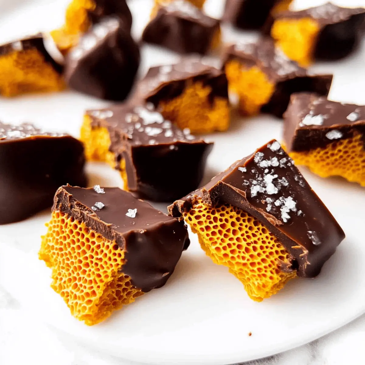 As I stirred the bubbling mixture in my pot, I couldn’t help but feel like a kid again, enchanted by the magic of candy making. Today, I’m excited to share with you my recipe for Easy Chocolate-Coated Honeycomb Candy—a treat that combines delightful crunch, smooth chocolate, and a hint of sea salt. This honeycomb candy recipe is wonderfully quick to whip up, making it the perfect indulgence for a last-minute gift or to curb your sweet cravings. Plus, you can easily customize it to create either airy honeycomb toffee or a soft sponge candy, so everyone can join in on the fun! So, how about we learn how to transform sugar into a crunchy masterpiece? Why is homemade honeycomb candy special? Unexpectedly simple: With just a few ingredients, you can create a delightful treat that will impress friends and family. Crunchy goodness: Enjoy the perfect combination of airy texture and rich chocolate coating, sure to satisfy any sweet tooth. Quick and fun: This recipe is perfect for a last-minute indulgence or a delightful family activity that brings smiles all around. Customization at its best: Switch between honeycomb toffee or sponge candy, or add your favorite nuts or extracts for a unique twist. Gift-ready: Pack your homemade honeycomb in festive boxes to share with loved ones or use as a charming party favor. Honeycomb Candy Ingredients Unlock the sweetness of homemade honeycomb candy with these simple, yet essential ingredients. For the Honeycomb Granulated White Sugar – Provides sweetness and structure for the honeycomb; stick to this for the best results. Golden Syrup – Gives a rich, caramelized flavor; substitutes like honey or corn syrup work in a pinch. Water – Essential for creating the sugar syrup; no substitutes on this one. Salt – Balances the sweetness; optional, but a little pinch goes a long way! Baking Soda – Creates that light, airy texture; make sure to use this for the signature honeycomb results. Gelatin (optional) – Adds a dense, sponge-like texture if you prefer a softer honeycomb; use as desired. For the Chocolate Coating Tempered Bittersweet Chocolate – Coats the candy to enhance flavor and offers a protective layer; feel free to use milk or dark chocolate too! Sea Salt Flakes – A sprinkle elevates the chocolate flavor; optional but highly recommended for a gourmet touch. Step‑by‑Step Instructions for honeycomb candy Step 1: Prepare Your Baking Pan Start by lining a 9-inch square baking pan with parchment paper, ensuring the paper hangs over the edges for easy removal. This step is critical for gaining a smooth release of your homemade honeycomb candy later on. Set the pan aside as you move on to the fun part—cooking the sugar mixture! Step 2: Combine Your Ingredients In a large saucepan, combine granulated white sugar, golden syrup, water, and a pinch of salt. Place the saucepan over medium-high heat, stirring gently until the sugar is completely dissolved—a process that should take about 5 minutes. Once dissolved, allow the mixture to come to a gentle boil, and keep an eye on it, ensuring it reaches the right temperature for your honeycomb candy. Step 3: Monitor the Temperature Using a candy thermometer, carefully monitor the bubbling syrup until it reaches 300°F (150°C). This stage is essential for achieving that perfect crunchy texture. You may notice the bubbling starting to slow down—this indicates you’re getting close to the desired temperature. Once it hits 300°F, quickly remove the saucepan from the heat. Step 4: Whisk in the Baking Soda Immediately whisk in the baking soda into the hot syrup. Be cautious, as the mixture will foam up dramatically! Stir rapidly to ensure the baking soda is fully integrated and the syrup gets that airy honeycomb texture. The bubbling will settle down within moments, revealing a frothy, transformative mixture ready to create your honeycomb candy. Step 5: Pour the Mixture into the Pan Carefully pour the foamy honeycomb mixture into your prepared baking pan, allowing it to spread and fill the edges without stirring. The mixture will begin to set as it cools, creating the signature crunchy structure for your honeycomb candy. Let it sit undisturbed at room temperature for about 1 hour until fully hardened. Step 6: Break into Pieces Once the honeycomb has set and is cool to touch, gently lift it from the pan using the parchment paper edges. Break it into desired-sized pieces. You’ll love the satisfying crunch as you separate it! After breaking, it’s time to indulge in your handmade honeycomb candy, or you can get creative with a chocolate coating! Step 7: Optionally Prepare Gelatin (for Sponge Candy) If you prefer a softer texture, you can bloom gelatin in a small amount of water. After dissolving the gelatin, whisk it into the sugar syrup before the baking soda. This step adds a delightful sponge-like texture to your honeycomb candy—just imagine the delicious variations you can create! Step 8: Chocolate Coating Time To coat your honeycomb candy, temper the bittersweet chocolate until it’s glossy and smooth. You can either dip or brush the broken candy pieces with chocolate, ensuring they’re well-covered. Sprinkle a few sea salt flakes on top before the chocolate sets for added flavor, and let them cool on a wire rack until the chocolate fully hardens. Step 9: Store Your Candy Once your chocolate-coated honeycomb candy is set, store the treats in an airtight container at room temperature. This helps maintain their crunchy texture, preventing humidity from affecting their freshness. Whether for yourself or as gifts, your homemade honeycomb candy is a delightful treat everyone will love! Expert Tips for Honeycomb Candy Pre-measure Ingredients: Start with all ingredients pre-measured to ensure swift execution, as the honeycomb mixture expands rapidly. Use a Large Pot: A large saucepan is key to avoid overflow when cooking the syrup during the boiling process. Stay Attentive: Monitor the syrup c