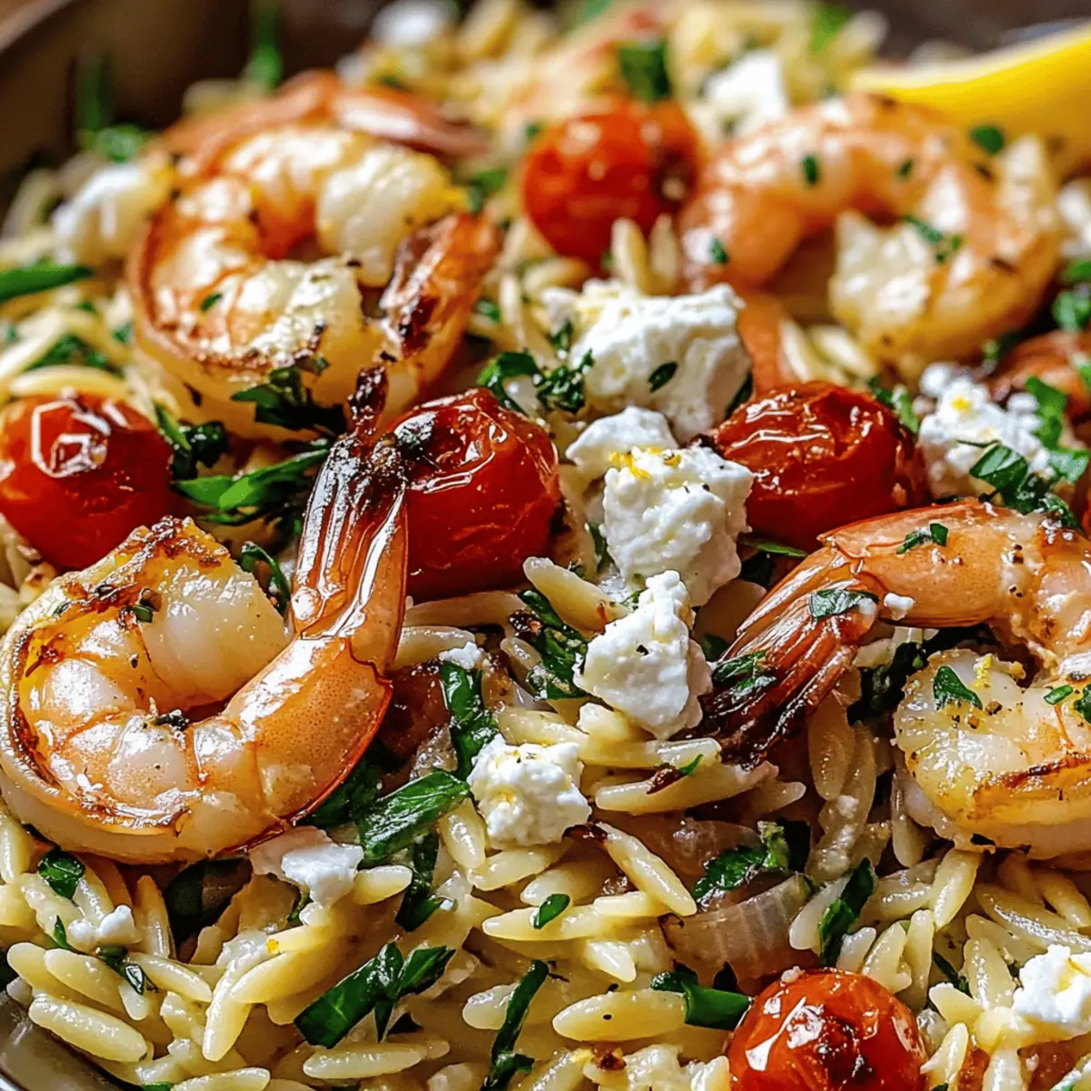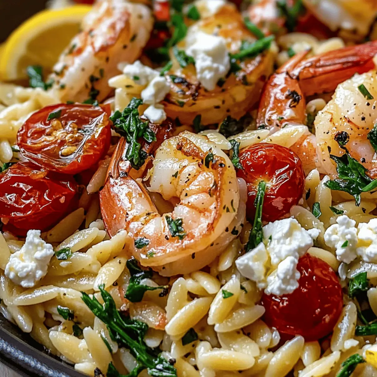 Jump to Recipe Print RecipeSummer evenings call for meals that are as refreshing as they are satisfying, and that’s exactly what this Lemon Feta Orzo with Roasted Shrimp delivers. Imagine tender orzo, perfectly complemented by succulent shrimp and tangy feta, all brought to life with a zesty lemon dressing—what a feast for the senses! This Mediterranean-inspired dish is not only a breeze to whip up in under 35 minutes, but it also offers the flexibility to swap shrimp for grilled chicken or tofu, accommodating various dietary needs. Plus, it shines whether served warm or at room temperature, making it the ultimate choice for picnics and gatherings! Intrigued about how to create this delightful dish? Let’s dive in! Why is Lemon Feta Orzo the Best? Simplicity at its best: This recipe comes together in under 35 minutes, making it perfect for busy weeknights. Irresistible flavors: The combination of tangy lemon, creamy feta, and savory shrimp creates a taste explosion that will have everyone asking for seconds. Versatile options: Easily swap in proteins like grilled chicken or tofu, accommodating various dietary preferences without sacrificing flavor. Perfect for gatherings: Served warm or at room temperature, it’s a crowd-pleaser at picnics or potlucks—pair it with Roasted Parmesan Green Beans for a complete meal! Nutritionally balanced: With high protein content and plenty of veggies, this dish is both light and satisfying. Enjoy it guilt-free, knowing you’re nourishing your body with wholesome ingredients! Lemon Feta Orzo Roasted Shrimp Ingredients • Dive into the fresh and vibrant flavors with these essential Lemon Feta Orzo Roasted Shrimp ingredients! For the Shrimp Large Shrimp – Succulent and quick-cooking; a perfect protein choice for this dish. Substitution: Grilled chicken or marinated tofu also work wonderfully here. Olive Oil – Richness and moisture for the shrimp; adds a lovely depth of flavor. Note: Opt for extra-virgin for the best taste. Kosher Salt & Black Pepper – Simple seasonings that enhance every ingredient. Note: Adjust quantities based on your taste preferences. Dried Oregano – Brings a warm, herbal touch that’s quintessential in Mediterranean cooking. Smoked Paprika – Imparts a delightful smoky undertone. Omit if you prefer less heat. Lemon Zest & Juice – Brightens the dish with zesty goodness. Tip: Fresh lemon ensures vibrant flavor throughout. For the Orzo Orzo Pasta – Forms the hearty base of the dish, soaking up all the wonderful flavors. Substitution: Try gluten-free orzo or other small pasta shapes if needed. Garlic – Aromatic and flavorful; enhances the dish beautifully. Preparation: Finely grate for even distribution. For the Vegetables and Herbs Cherry Tomatoes – Adds sweetness and vibrant color; halving them helps integrate them better. Baby Spinach – Offers freshness and a pop of green; wilts perfectly when mixed with warm ingredients. Fresh Parsley & Dill – Bright, fresh herbs that elevate the dish; feel free to substitute with basil or mint if preferred. For the Creaminess Feta Cheese – Creamy and tangy, it’s a key component that ties everything together. Substitution: Soft goat cheese can be used for a milder flavor. Capers – Optional, for a briny bite that adds depth and complexity. With this array of ingredients, you’re all set to create a memorable Lemon Feta Orzo with Roasted Shrimp dish that delights the senses! Step‑by‑Step Instructions for Lemon Feta Orzo Roasted Shrimp Step 1: Prepare the Shrimp Preheat your oven to 425°F (220°C) and line a baking sheet with parchment paper for easy cleanup. In a mixing bowl, toss the large shrimp with olive oil, kosher salt, black pepper, dried oregano, smoked paprika, and lemon zest until evenly coated. Spread the shrimp in a single layer on the baking sheet and roast them in the preheated oven for 8-10 minutes, or until they are opaque and slightly curled. Step 2: Cook the Orzo While the shrimp is roasting, bring a large pot of salted water to a boil. Add the orzo pasta, stirring occasionally, and cook according to package instructions until it reaches al dente, usually about 8-10 minutes. Once cooked, drain the orzo through a colander and immediately return it to the pot to keep warm as it will absorb the flavors added next. Step 3: Flavor the Orzo While the orzo is still hot, drizzle in some olive oil and freshly squeezed lemon juice. Add the finely grated garlic and a pinch of crushed red pepper flakes if desired. Stir well to combine, ensuring each piece of orzo is coated in the zesty mixture. This step enhances the orzo and preps it to soak in the delicious flavors from the fresh ingredients to come. Step 4: Add Vegetables Fold in halved cherry tomatoes and baby spinach into the warm orzo mixture. The heat from the orzo will slightly wilt the spinach and warm the tomatoes, intensifying their flavors. Continue to gently mix until the spinach is just wilted, creating a vibrant medley of colors and fresh ingredients that work beautifully with the Lemon Feta Orzo Roasted Shrimp. Step 5: Incorporate Cheese and Capers Next, gently mix in the crumbled feta cheese, allowing it to slightly melt into the warm orzo and vegetables. If you’re including capers for added brininess, fold them in now. This step brings rich creaminess and an irresistible tang to the dish, marrying all the elements together in the Lemon Feta Orzo Roasted Shrimp. Step 6: Finish the Dish Finally, remove the roasted shrimp from the oven and top the orzo mixture with these succulent morsels. Serve the Lemon Feta Orzo Roasted Shrimp warm or at room temperature, garnished with a sprinkle of extra fresh parsley or dill, and add lemon wedges on the side for an extra burst of citrus. Enjoy this vibrant dish that captures the essence of Mediterranean flavors! Storage Tips for Lemon Feta Orzo Roasted Shrimp Fridge: Store leftovers in an airtight container for up to 2 days. The flavors deepen as th