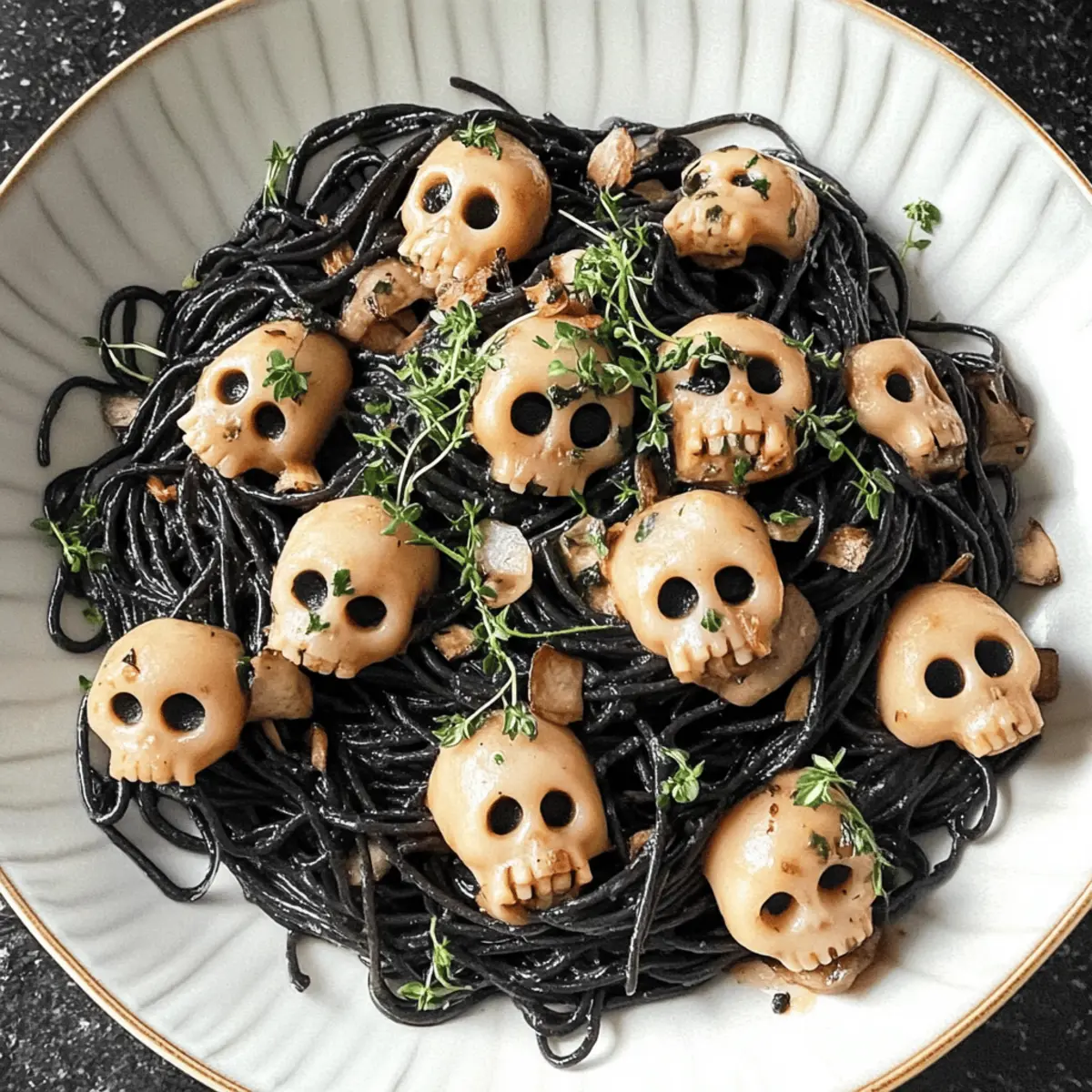 As I stirred the pot, a delightful aroma wafted through the air, teasing my senses and filling me with anticipation. This Halloween, I’m excited to share a fun recipe that’s perfect for both kids and adults: Mushroom Skulls Spooky Pasta. With its creamy sauce and the unique flair of squid ink spaghetti, it transforms a simple meal into a festive centerpiece that adds a playful touch to your holiday table. Not only is this dish a visual delight, but it also delivers on comfort and flavor, ensuring a delicious dinner without the stress. So, gather your loved ones, roll up your sleeves, and let’s dive into this spook-tacular culinary adventure together! What Halloween-themed twist will you add to make it your own? Why Will You Love Mushroom Skulls Pasta? Fun and Festive: This dish is not just a meal; it’s a conversation starter! The playful skull shapes make it a hit at Halloween gatherings, appealing to kids and adults alike. Creamy Richness: A decadent creamy sauce envelops each bite, bringing comfort and smiles to the table. It’s the perfect antidote to fast food fatigue! Unique Ingredients: The use of squid ink spaghetti makes this pasta dish visually stunning and adds a subtle flavor twist that will impress your guests. Versatile Options: Whether you prefer classic bacon or a vegetarian twist with shiitake mushrooms, this recipe adapts beautifully to your needs. Want to make it even more imaginative? Try serving it with a side of salad for a balanced meal! Dive into the mysterious flavor adventure of Halloween Mushroom Skulls Spooky Pasta and elevate your festive cooking! Mushroom Skulls Spooky Pasta Ingredients • Get ready to create something magical with these essential ingredients! For the Pasta Squid Ink Spaghetti – Adds a unique color and flavor; alternative: regular spaghetti for a non-themed version. For the Mushroom Skulls Button Mushrooms (16) – Form the skulls for decoration and flavor; use portobello for larger skulls. For the Sauce Butter (2.5 tablespoons) – Provides richness and facilitates browning; substitute with olive oil for a dairy-free option. Olive Oil (1 tablespoon) – Helps brown the mushrooms; can be replaced with more butter or avocado oil. Brown Onion (1 small) – Creates a flavorful base for the sauce; yellow onion can be used as a substitute. Bacon (100 grams) – Adds a savory depth; turkey or chicken bacon may work for lighter options. Garlic (2-3 cloves) – Enhances flavor; use garlic powder if fresh is unavailable. Dry White Wine (125 ml, ½ cup) – Deglazes the pan and adds acidity; replace with vegetable broth for a non-alcoholic version. Thickened Cream (125 ml, ½ cup) – Provides creaminess; use coconut cream or a dairy-free alternative for a lighter option. Parmesan Cheese (85 grams, 3 oz) – Adds umami; can substitute with nutritional yeast for a vegan version. Fresh Thyme (½ bunch) – Adds freshness; substitute with oregano if out of thyme. Now that you have everything lined up, let the creativity flow as you prepare this Mushroom Skulls Spooky Pasta for a Halloween feast that will tantalize taste buds and inspire smiles all around! Step‑by‑Step Instructions for Mushroom Skulls Spooky Pasta Step 1: Prepare the Mushroom Skulls Start by carefully carving out the eye sockets in your button mushrooms to form spooky skulls. Halve each mushroom, ensuring you cut the eye sockets first to avoid splitting. Set the prepared mushroom skulls aside, ready to create a chilling and delicious topping for your Mushroom Skulls Spooky Pasta. Step 2: Boil the Pasta In a large pot, bring salted water to a rolling boil over high heat. Once boiling, add the squid ink spaghetti and cook according to package instructions until al dente. Remember to stir occasionally to prevent sticking. Once cooked, reserve a cup of the pasta water, then drain the spicy squid ink spaghetti and return it to the pot. Step 3: Sauté the Mushroom Skulls In a large frying pan, melt 2 tablespoons of butter with 1 tablespoon of olive oil over medium heat. Once hot, place the mushroom skulls cut side down in the pan. Sauté the mushrooms for about 5-6 minutes or until they are nicely browned and golden. Flip the mushrooms and cook for an additional minute, then remove them from the pan and set aside. Step 4: Cook the Onion and Bacon In the same pan, add the remaining 0.5 tablespoons of butter and diced brown onion. Sauté over medium heat for about 5 minutes until the onions are soft and translucent. Next, add your chopped bacon, cooking for another 2-3 minutes until it’s crispy. This step will create a heavenly aroma and a savory base for your creamy sauce. Step 5: Add Garlic and Deglaze with Wine Stir in minced garlic and pour in the dry white wine, scraping up any browned bits from the bottom of the pan. Allow the wine to reduce by half, which should take around 2-3 minutes. This helps to intensify the flavors in your Mushroom Skulls Spooky Pasta sauce and gives it a delightful depth. Step 6: Make the Creamy Sauce Pour in ½ cup of thickened cream and stir gently to combine. Let the sauce simmer on low heat for about 5 minutes until it thickens slightly. Add most of the grated parmesan cheese, stirring continuously until it’s completely melted and integrated into the sauce, creating a deliciously creamy texture. Step 7: Combine Pasta and Sauce Reduce the heat to low and add the drained squid ink spaghetti to the pan with the sauce. Toss everything together gently, ensuring the pasta is well coated with the creamy mixture. If needed, add reserved pasta water a little at a time to achieve your desired sauce consistency, making sure it clings beautifully to the pasta. Step 8: Incorporate Mushroom Skulls Gently toss in the sautéed mushroom skulls into the creamy pasta, allowing them to warm through for a minute or so. This will help the flavors meld together while keeping the spooky vibe alive in your Mushroom Skulls Spooky Pasta. Be careful not to break the sku