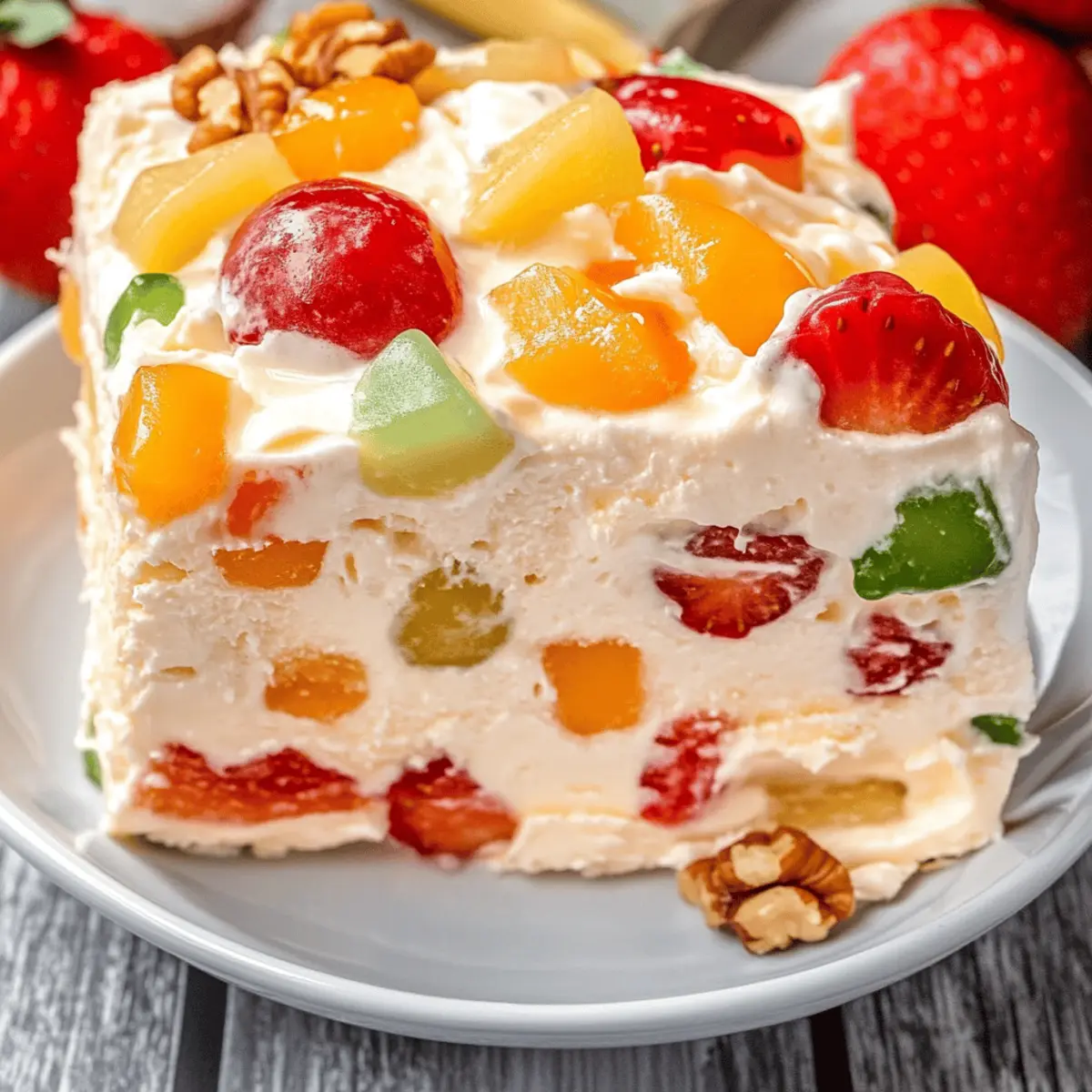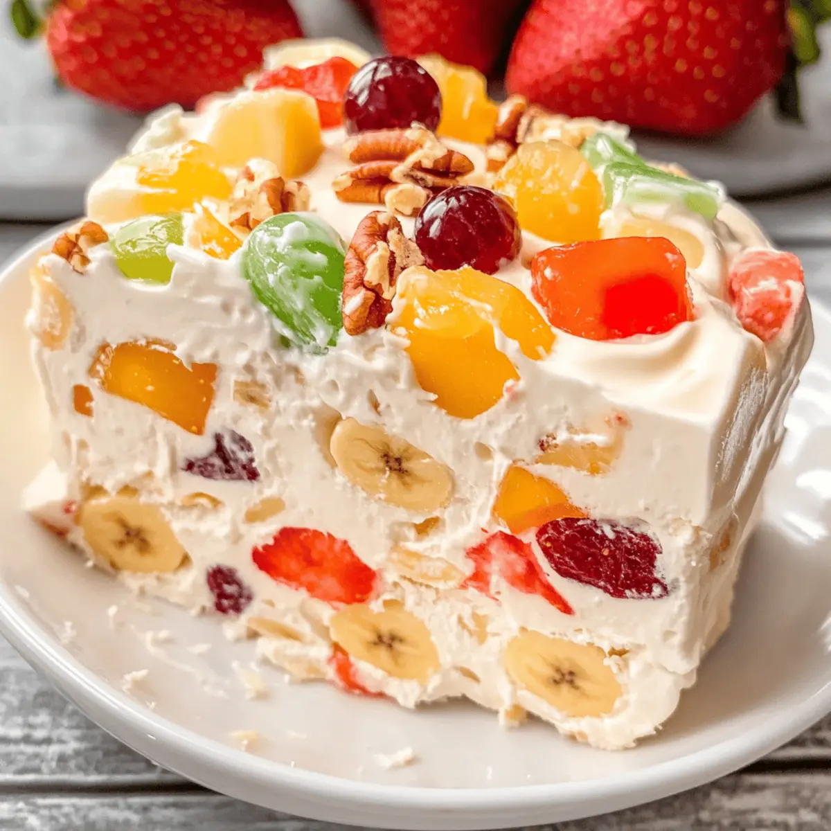 Jump to Recipe Print RecipeAs I flipped through my recipe box filled with cherished family recipes, a wave of nostalgia washed over me, and there it was—Nana’s Frozen Fruit Salad. This delightful dish has been gracing our family gatherings for generations, offering a refreshing escape from the heat of summer and a pop of color at holidays. Filled with a medley of fresh fruit, creamy layers, and just the right crunch from nuts, it’s a potluck-friendly option that’s not only simple to prepare but also endlessly customizable. You can whip it up ahead of time and let the freezer do the magic, making it a go-to solution for busy days. Ready to bring a touch of nostalgia to your kitchen? Let’s dive into this refreshing dessert that’s sure to impress everyone at your next gathering! Why is Nana’s Frozen Fruit Salad Special? Nostalgic Flavor: This recipe harkens back to cherished family memories, making it a delightful treat for gatherings. Effortless Preparation: With just a few simple steps, you can create a dessert that looks as impressive as it tastes. Customizable Options: Feel free to experiment with seasonal fruits or nuts, tailoring it to your taste—whether using strawberries, bananas, or even tropical fruits like pineapple, the possibilities are endless! Crowd-Pleasing: Perfect for potlucks, it’s a dish that friends and family will adore. Plus, it can be made ahead and frozen, freeing you up to enjoy the party! If you’re looking for something equally refreshing, try Cucumber Chicken Salad or Broccoli Cauliflower Salad for your next event! Nana’s Frozen Fruit Salad Ingredients For the Batter Whipped Cream – Provides creaminess and lightness; you can substitute with cool whip for a non-dairy option or Greek yogurt for a tangy twist. Cream Cheese – Adds richness and creamy texture; use low-fat cream cheese for a lighter version. Mixed Fruit (e.g., strawberries, bananas, grapes) – Contributes fresh, vibrant flavors; feel free to substitute any seasonal fruit or use frozen fruits if fresh are unavailable. For the Crunch Pecans (or Walnuts) – Offers crunch and nutty flavor; you can substitute with sunflower seeds for a nut-free option. For Sweetness Sugar – Sweetens the salad; adjust based on fruit sweetness, and consider reducing sugar for a less sweet result or using a sugar substitute. Optional Flavor Enhancer Shredded Coconut – Adds tropical flavor and texture; feel free to omit if you’re not a coconut fan or for dietary restrictions. This delightful collection of ingredients is what makes Nana’s Frozen Fruit Salad not only a refreshing dessert but also a versatile recipe that you can tailor to your tastes! Step‑by‑Step Instructions for Nana’s Frozen Fruit Salad Step 1: Prepare the Cream Cheese Mixture Begin by placing the cream cheese in a large mixing bowl. Using an electric mixer, blend it with the sugar on medium speed until the mixture is smooth and creamy, about 2-3 minutes. You want to ensure there are no lumps, so it’s crucial that the cream cheese is at room temperature before this step. Step 2: Fold in Whipped Cream Gently fold in the whipped cream using a spatula, being careful to incorporate it fully without deflating the mixture. This should take about 2 minutes of careful folding. The goal is a light, fluffy mixture that is evenly combined, setting the foundation for Nana’s Frozen Fruit Salad to achieve its luscious consistency. Step 3: Add Mixed Fruit and Nuts Next, carefully add your choice of mixed fruit and pecans or walnuts to the bowl. Stir gently to combine, making sure the fruit stays intact and colorful. This will take about 1-2 minutes. The vibrant colors of the fruit will create a visually appealing mix, contributing fantastic flavor to the salad. Step 4: Include Shredded Coconut (Optional) If you’re using shredded coconut, now is the time to fold it into the fruit mixture. Lightly combine for about 1 minute to evenly distribute the coconut without breaking down the fruit. This step adds a delightful texture and tropical flavor to your Nana’s Frozen Fruit Salad. Step 5: Transfer to Freezer-Friendly Container Spoon the complete mixture into a freezer-safe container, smoothing out the top with a spatula. Ensure it’s sealed tightly to prevent freezer burn. Place the container in the freezer for at least 4-6 hours, or until the salad is fully firm. This time in the freezer allows all the flavors to meld beautifully. Step 6: Serve After Softening When you’re ready to serve Nana’s Frozen Fruit Salad, remove it from the freezer and let it sit at room temperature for about 10-15 minutes. This will soften the salad just enough to make it scoopable and enhance the delightful creamy texture. Your refreshing dessert is now ready to impress at any gathering! What to Serve with Nana’s Frozen Fruit Salad Imagine a table set for laughter and love, with refreshing dishes that complement each other perfectly. Grilled Chicken Skewers: Juicy, tender chicken with a hint of smoky flavor brings a satisfying savoriness that contrasts delightfully with the cool sweetness of the salad. Crispy Garlic Bread: The crunch and buttery flavor of garlic bread make for a delightful contrast, offering a satisfying companion for that refreshing fruit medley. Zesty Pasta Salad: Bright flavors from a pasta salad filled with veggies create a harmony of tastes, enhancing the overall meal and keeping it light and vibrant. Coleslaw: Crisp, tangy slaw brings a crunchy texture and zesty bite, balancing the sweetness of the salad while adding refreshing crunchiness. Lemonade or Iced Tea: A glass of homemade lemonade or iced tea can uplift the meal, offering a refreshing and thirst-quenching complement to the dessert. Chocolate Chip Cookies: For a sweet finish, pair the fruit salad with chewy cookies; the contrasting textures of creamy fruit and soft cookies create a delightful indulgence. Bringing together these dish pairings will create a balanced, 