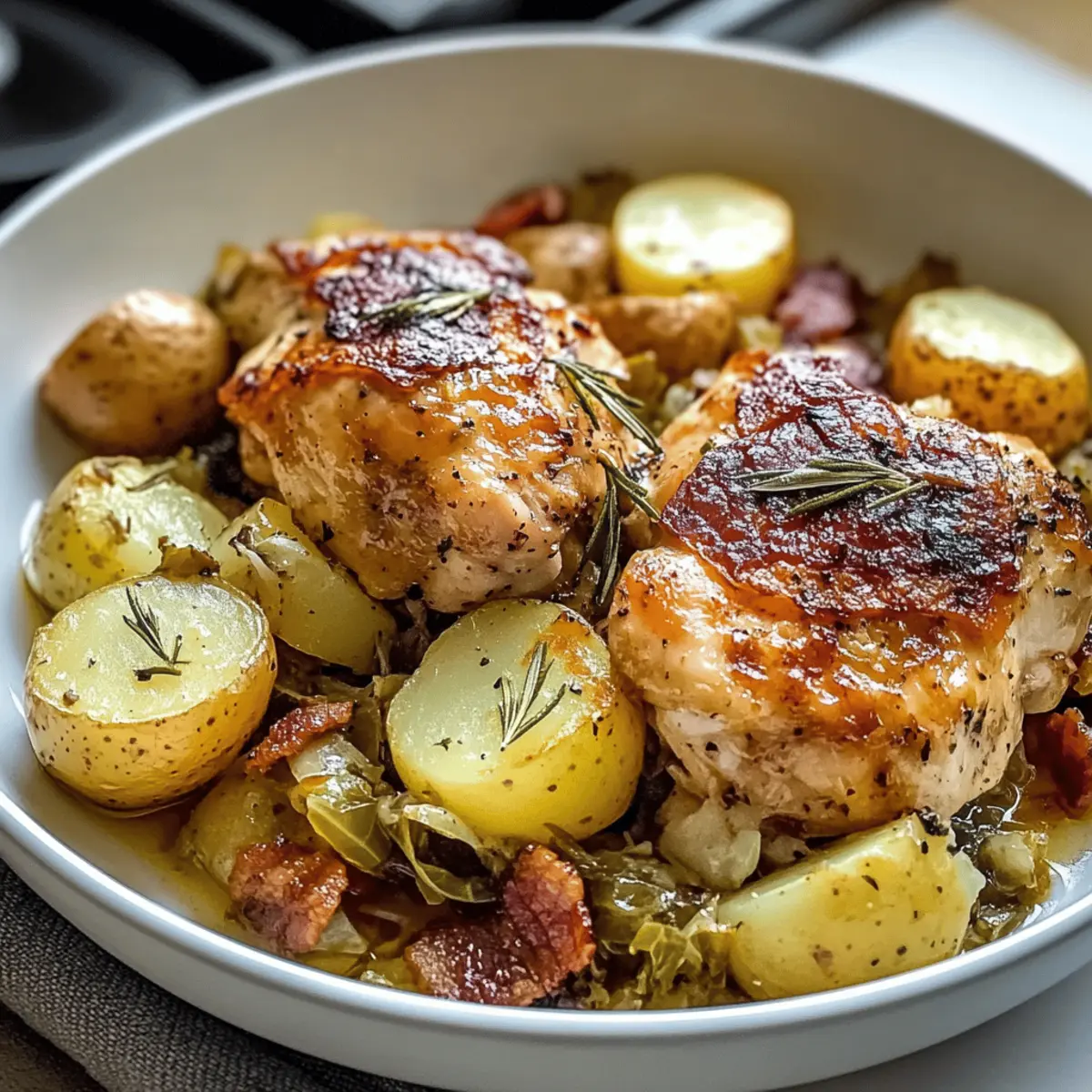 Jump to Recipe Print RecipeAs I stood in my kitchen, the enticing aroma of sizzling bacon wrapped around me like a warm hug, I knew I was about to create something magical. This One Pot Irish Chicken is more than just a meal; it’s a journey into comforting flavors of traditional Irish cuisine. With tender chicken, crispy bacon, and a medley of hearty vegetables like potatoes and cabbage, you can whip up a rich and satisfying dinner with minimal cleanup. Perfect for those chilly evenings or celebrating St. Patrick’s Day, this delightful dish checks all the boxes for comfort food lovers. Plus, it offers a gluten-free option, making it a hit for everyone at the table. Ready to fill your home with delicious aromas and warm hearts? Let’s dive into this one-pot wonder. Why is One Pot Irish Chicken a must-try? Hearty Comfort: This One Pot Irish Chicken is the epitome of hearty comfort food, combining tender chicken with crispy bacon for a rich depth of flavor. Minimal Cleanup: Say goodbye to piles of dishes; this one-pan recipe simplifies your cooking experience without sacrificing taste. Versatile Ingredients: You can easily adapt the recipe by swapping proteins or adding more veggies, ensuring there’s something for everyone’s palate. Nutritional Balance: Packed with protein and nutrients from the vegetables, it’s a well-rounded dish that satisfies your cravings without guilt. Festive Appeal: Perfect for chilly nights or festive occasions like St. Patrick’s Day, this dish is sure to impress friends and family alike! Pair your meal with traditional Irish soda bread or a fresh green salad for a complete feast. For more comforting recipes like this, check out our delicious Cheesy Chicken Spinach or Balsamic Glazed Chicken. One Pot Irish Chicken Ingredients For the Chicken • Chicken – Choose bone-in pieces for more flavor and a juicy texture. • Bacon – Adds a savory, smoky depth to the dish; opt for turkey bacon for a lighter twist. For the Vegetables • Cabbage – Provides texture and essential nutrients; both green and savoy cabbage work beautifully. • Potatoes – A hearty base that soaks up flavors; Yukon Gold or red potatoes are ideal. • Onions – For sweetness and depth; yellow onions achieve the best results. For the Seasoning • Thyme – Infuses an earthy aroma; both fresh and dried versions are suitable. • Smoked Paprika – Adds warmth and a hint of smokiness that enhances the overall flavor. • Garlic Powder – Elevates the taste; you can use fresh garlic as a substitute (1 clove = 1/8 tsp garlic powder). • Onion Powder – For an extra kick of onion flavor, but skip if you’re using fresh onions. Embrace the flavorful experience of this One Pot Irish Chicken, a comforting meal that’s bound to become a family favorite! Step‑by‑Step Instructions for One Pot Irish Chicken Step 1: Preheat the Oven Begin by preheating your oven to 400°F (200°C). This temperature is perfect for achieving tender chicken and perfectly roasted vegetables. While the oven warms up, gather your large cast iron skillet or Dutch oven, as it will be essential for this one-pan cooking adventure. Step 2: Cook the Bacon In your preheated skillet, cook the bacon over medium heat until it becomes crispy and golden brown, about 5-7 minutes. Use a slotted spoon to remove it from the pan and set it aside on a plate lined with paper towels to absorb excess grease. The rendered bacon fat will be used to enhance the flavors of your One Pot Irish Chicken. Step 3: Sear the Chicken Next, add your chicken pieces to the same skillet, skin side down, and sear them for 4-5 minutes on each side until they are golden brown. This step locks in juices and adds a lovely flavor base for your dish. Once nicely browned, remove the chicken from the skillet and set aside with the bacon. Step 4: Sauté the Onions In the leftover fat, add chopped onions and sauté over medium heat for about 3-4 minutes until they are translucent. Stir occasionally to prevent burning, as this step builds depth and sweetness to the dish. You’ll know they are ready when they turn soft and fragrant, providing a perfect foundation for your One Pot Irish Chicken. Step 5: Add Potatoes and Cabbage Now it’s time to introduce chopped potatoes and shredded cabbage to the skillet. Toss everything together for about 2-3 minutes, ensuring the vegetables are well coated in the flavorful fats and seasonings. This brief sauté enhances their taste and helps them absorb the delicious flavors of the One Pot Irish Chicken. Step 6: Combine Ingredients Return the seared chicken and crispy bacon to the pan, nestling them among the vegetables. Sprinkle your spices, including thyme and smoked paprika, ensuring an even distribution of flavor. This hearty combination will create the comforting essence characteristic of the One Pot Irish Chicken. Step 7: Bake the Dish Cover the skillet with a lid or foil and place it in your preheated oven. Bake for 35-40 minutes, or until the chicken has reached an internal temperature of 165°F (74°C) and the vegetables are tender. The dish should emit a tantalizing aroma, indicating it’s cooking beautifully. Step 8: Let it Rest After baking, remove the skillet from the oven and let the One Pot Irish Chicken rest for 5 minutes before serving. This crucial step allows the juices to redistribute, ensuring a moist and flavorful dish. The aroma will entice everyone as they eagerly await this hearty comfort meal. What to Serve with One Pot Irish Chicken Creating a warm and inviting dinner around this One Pot Irish Chicken will elevate the entire meal experience. Creamy Mashed Potatoes: The buttery richness of creamy mashed potatoes pairs perfectly, soaking up all the savory flavors of the dish. Irish Soda Bread: Crisp on the outside and soft inside, it’s wonderful for mopping up the delicious sauce from your chicken. There’s nothing like fresh bread to make a meal feel complete! Fresh Green Salad: A refr