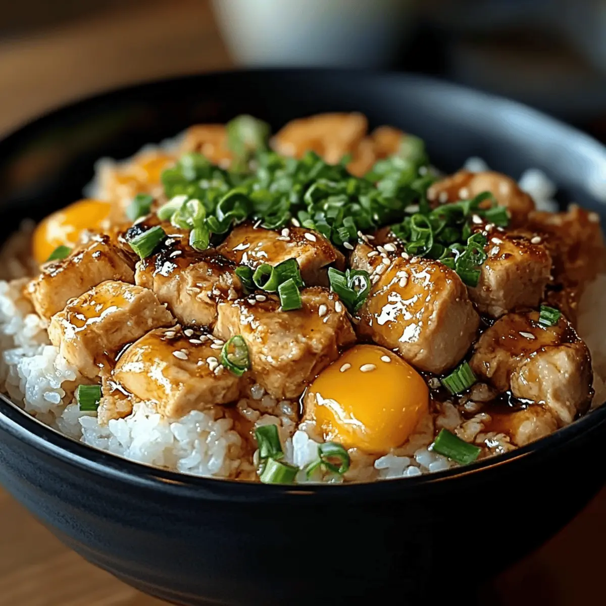 As the comforting aroma of simmering dashi fills my kitchen, I can’t help but feel transported to a cozy Japanese eatery. Oyakodon, a delightful Japanese chicken and egg rice bowl, effortlessly combines juicy chicken and fluffy eggs under a savory sauce, all served over a soft bed of short-grain rice. This dish is a true game-changer for busy weeknights, offering both incredible flavor and the warmth of a home-cooked meal in under 30 minutes. Plus, it’s family-friendly, making it a hit at the dinner table. Ready to impress your loved ones with this simple yet satisfying Oyakodon dish? Let’s dive into the recipe and uncover the secrets to crafting this beloved comfort food at home! Why is Oyakodon a Must-Try Dish? Simplicity: Creating this dish is a breeze, making it perfect for any home cook, even on rushed weeknights. Rich, Flavorful Sauce: The combination of dashi, soy sauce, and mirin melds together, delivering an umami richness that elevates the entire meal. Heartwarming Comfort Food: Oyakodon offers that cozy feeling of home-cooked love, making it a favorite among family and friends. Versatile Ingredient Options: Feel free to swap chicken for tofu or toss in seasonal vegetables for variety and added nutrition. Quick Cooking Time: In just under 30 minutes, you can serve a delectable meal to satisfy the whole family, with minimal cleanup! Enjoy it alone or pair it with a side of miso soup for a complete Japanese dining experience! Oyakodon Dish Ingredients Get ready to whip up an amazing Oyakodon dish with these essential ingredients! For the Rice • Japanese Short-Grain Rice – The ideal base for Oyakodon; rinse thoroughly and cook until fluffy for the best texture. For the Chicken and Sauce • Boneless, Skinless Chicken Thighs – Recommended for their tenderness; substitute with chicken breast for a leaner option. • Onion – Provides a touch of sweetness; use a medium onion, or opt for shallots for a milder flavor. • Dashi Stock (or Chicken Broth) – Infuses the dish with authentic flavor; consider low-sodium options for better control over saltiness. • Soy Sauce – Brings umami richness; tamari or coconut aminos works as a gluten-free alternative. • Mirin (Sweet Rice Wine) – Adds a lovely sweetness; if unavailable, mix sugar with water in equal parts as a substitute. • Sake – Enhances depth of flavor; optional, but can be omitted if you don’t have it on hand. • Sugar – Balances the savory elements; adjust to suit your taste preferences. For the Eggs • Eggs – Creates a creamy texture; use fresh, large eggs, or swap with silken tofu for a vegetarian alternative. For Garnishing • Green Onions – Adds a fresh flavor on top; chives make an excellent substitute if needed. • Shichimi Togarashi (Japanese Seven Spice) – An optional kick of heat; red pepper flakes can work if you like it spicy. Now that you have the ingredients ready, it’s time to bring the comforting Oyakodon dish to life! Enjoy the journey through this warm, savory experience. Step‑by‑Step Instructions for Oyakodon Dish Step 1: Cook the Rice Rinse 1 cup of Japanese short-grain rice under cold water until the water runs clear. Cook it in a rice cooker or on the stovetop with the appropriate amount of water until fluffy, typically about 18-20 minutes. Once done, let it steam for a few minutes before fluffing it with a fork, keeping it warm for the Oyakodon dish. Step 2: Prepare Chicken & Onion While the rice is cooking, take 2 boneless, skinless chicken thighs and cut them into bite-sized pieces. Thinly slice 1 medium onion. Set aside both ingredients as you prepare to bring them together. The chicken should be tender, and the onion will add a sweet depth to your comforting Oyakodon. Step 3: Beat Eggs Crack 2 large fresh eggs into a bowl and whisk them lightly until fully combined. This will create a fluffy, creamy texture that will bind beautifully with the other ingredients. Set the bowl of beaten eggs aside while you continue preparing the other components of the dish. Step 4: Simmer Stock In a large skillet or donburi pan, pour in 1 cup of dashi stock or low-sodium chicken broth. Heat over medium-high until it comes to a simmer, watching closely for bubbles to appear. The simmering stock will serve as the flavorful base for the Oyakodon, enhancing all the ingredients. Step 5: Cook Chicken Add the bite-sized chicken pieces into the simmering stock, ensuring they are submerged. Cook for about 5 minutes, or until the chicken turns white and is no longer pink in the center. This step is crucial for ensuring your chicken is tender and infused with the rich flavors of the broth. Step 6: Add Onion Stir in the sliced onion to the skillet and let it cook alongside the chicken for about 3-4 minutes. The onions should turn translucent, softening and sweetening as they begin to blend into the savory mixture of chicken and stock. This will elevate the flavor profile of your Oyakodon dish. Step 7: Season Mixture Add in 2 tablespoons of soy sauce, 1 tablespoon of mirin, 1 tablespoon of sake, and 1 teaspoon of sugar. Stir gently to combine. Allow this mixture to simmer for another 2-3 minutes until it slightly thickens, ensuring the flavors meld beautifully together, creating a savory sauce for the Oyakodon. Step 8: Add Eggs Pour the whipped eggs evenly over the chicken and onion mixture, avoiding stirring. Cover the skillet with a lid and reduce the heat to low. Cook for about 5 minutes or until the eggs are just set and slightly runny for a creamy texture. This step ensures the eggs create a luscious layer atop your chicken. Step 9: Assemble Bowls Divide the warm, fluffy rice into two bowls. Using a spatula, carefully scoop the chicken and egg mixture on top of the rice, ensuring you include some flavorful sauce in each serving. The combination of rice with the tender chicken and creamy egg will create a harmonious base for your Oyakodon dish. Step 10: Garnish & Serve Sprinkle chopped 