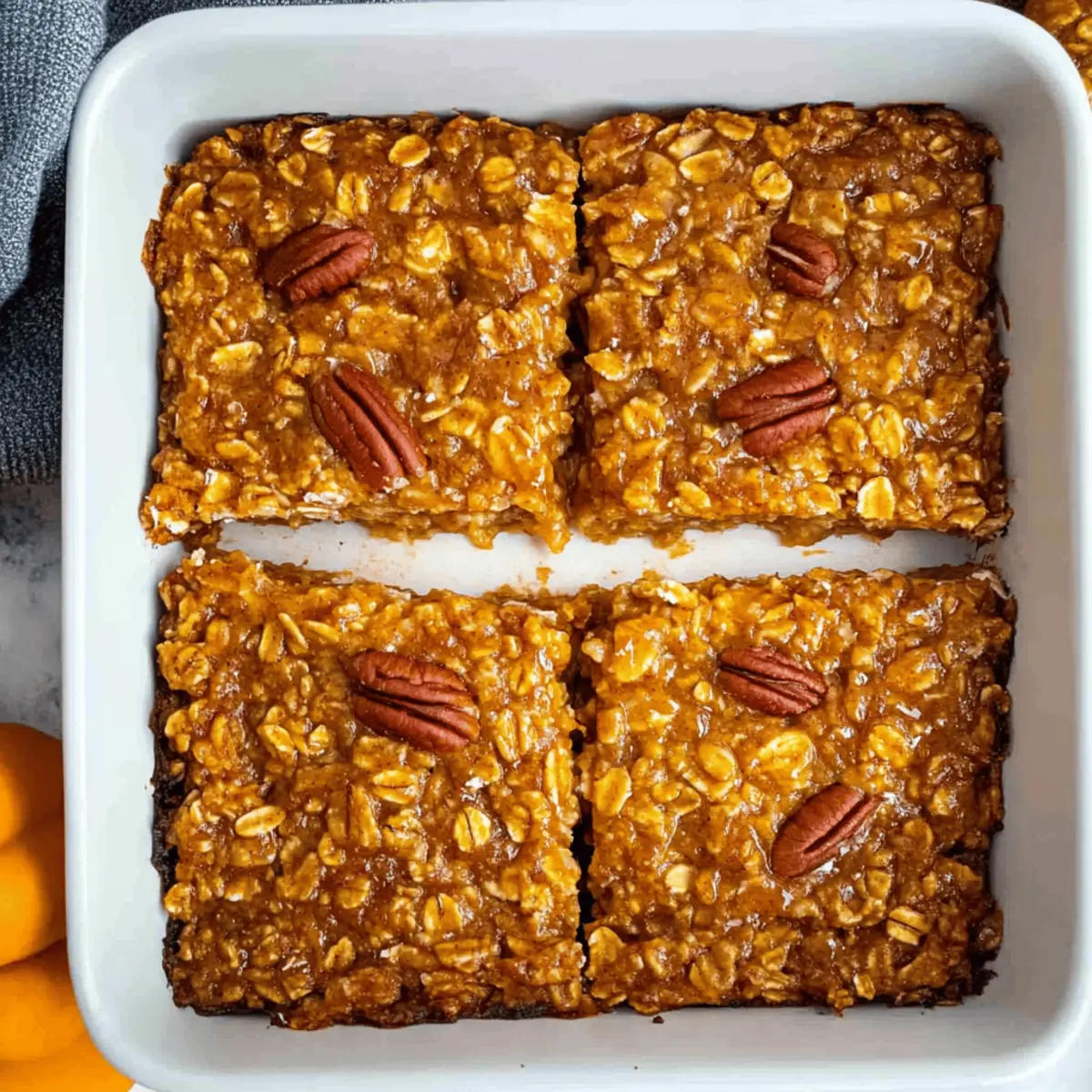 Jump to Recipe Print RecipeAs the leaves begin to change and the air turns crisp, there’s a comforting aroma that wafts through my kitchen—the scent of my Healthy Pumpkin Baked Oatmeal. This delightful breakfast option combines hearty rolled oats with pumpkin puree and warming spices, providing a nutritious start to even the busiest of mornings. Not only is it a breeze to prepare, but it also offers a gluten-free, make-ahead solution for those who crave a wholesome meal sans the hustle. Each slice is moist, fluffy, and reminiscent of a cozy fall evening spent nestled under a warm blanket. Curious to discover how to whip up this satisfying dish? Let’s dive in! Why is Pumpkin Baked Oatmeal a Must-Try? Simplicity at Its Best: This recipe is incredibly straightforward, making it perfect for even the busiest mornings. Nourishing and Filling: Packed with fiber and nutrients, every slice provides lasting energy without the sugar crash. Versatile Options: Whether you’re gluten-free, dairy-free, or vegan, this oatmeal can be easily tailored to your dietary preferences, similar to our Baked Garlic Parmesan Potato Wedges. Crowd-Pleasing Flavor: The blend of pumpkin and spices evokes autumn flavors, winning over family and friends alike. Make-Ahead Efficiency: Prepare it once and enjoy for days, just like our Baked Oatmeal Bars for busy weekdays! Comforting Texture: With its custard-like fluffiness, it satisfies both the heart and the palate. Pumpkin Baked Oatmeal Ingredients For the Oatmeal Rolled Oats – The base providing structure and fiber; opt for certified gluten-free oats if needed. Pumpkin Puree – Adds moisture and a rich pumpkin flavor; mashed bananas can be used for a unique twist. Maple Syrup – Your natural sweetener for depth in flavor; consider honey or agave syrup as substitutes. Milk – Enhances creaminess; choose dairy milk for a classic touch or almond milk for a dairy-free option. Egg – Binds everything together beautifully; for a vegan version, swap with a flax egg made from ground flaxseed and water. For Flavor and Texture Baking Powder – Essential for helping your oatmeal rise. Salt – Enhances the overall flavor profile and balances sweetness. Spices (cinnamon, nutmeg, ginger) – Give that classic pumpkin pie flavor; tweak according to your spice preference. Pecans – Introduces crunch and healthy fats; can be replaced with walnuts or omitted for a nut-free option. This Pumpkin Baked Oatmeal not only warms your heart but is also a nutritious choice for the whole family! Enjoy making your cozy mornings even better. Step‑by‑Step Instructions for Pumpkin Baked Oatmeal Step 1: Preheat the Oven Start by preheating your oven to 350°F (175°C). This step is crucial for ensuring your Pumpkin Baked Oatmeal cooks evenly. While the oven warms up, gather your ingredients and baking dish, preparing for an easy and enjoyable cooking experience. Step 2: Mix the Dry Ingredients In a large mixing bowl, combine rolled oats, baking powder, salt, cinnamon, nutmeg, and ginger. Whisk them together until evenly mixed, allowing the spices to release their aromatic essence. This dry base sets the stage for the delicious Pumpkin Baked Oatmeal, providing structure and flavor. Step 3: Combine the Wet Ingredients In a separate bowl, whisk together the pumpkin puree, milk, maple syrup, and egg (or flax egg for a vegan option). Ensure the mixture is smooth and well-blended, allowing the flavors to meld beautifully. This wet mixture will bring moisture and sweetness to your Pumpkin Baked Oatmeal, making it delightful. Step 4: Blend Wet and Dry Ingredients Pour the wet mixture into the bowl of dry ingredients. Gently stir with a spatula until just combined; be careful not to overmix, as this can affect the texture. If you’re using pecans, fold them in now for extra crunch. Your batter should be moist but still cohesive. Step 5: Bake Pour the oatmeal batter into a greased baking dish, spreading it out evenly. Bake in your preheated oven for 30-35 minutes. You’ll know it’s ready when the top is golden brown and a toothpick inserted in the center comes out clean. The aroma of pumpkin spices will fill your kitchen! Step 6: Cool and Serve Once baked, remove your Pumpkin Baked Oatmeal from the oven and let it cool for about 10 minutes. This waiting period allows the flavors to settle. Cut into squares or slices, and serve warm, or at room temperature, for a cozy breakfast or snack that everyone will love. What to Serve with Pumpkin Baked Oatmeal Indulge in a hearty breakfast experience that warms the soul and nourishes the body with delightful pairings. Greek Yogurt: A creamy topping that adds protein and tang, providing contrast to the sweet, spiced oatmeal. Fresh Berries: Bright and juicy, they bring freshness and a pop of color, enhancing the overall flavor of the dish. Honey Drizzle: A touch of extra sweetness, this natural sweetener complements the warm spices beautifully and enhances the flavor profile. Maple Syrup: Pour over for a classic touch, adding a rich, caramel-like sweetness that accentuates the pumpkin flavor. Chopped Nuts: Add a crunchy element with walnuts or pecans, bringing texture and healthy fats to each delicious bite. Their nutty flavor pairs wonderfully with the spices. Cinnamon Sugar: A sprinkle on top elevates the dish’s warmth with an additional layer of sweetness and flavor, taking your breakfast to the next level. Almond Milk: Serve alongside for a comforting drink complimenting the flavors, keeping your morning breakfast wholesome and dairy-free. Banana Slices: Add as a side for a nutritious boost, providing creamy sweetness and additional fiber to your meal. Chai Latte: This spiced, warm beverage offers a cozy complement to your oatmeal, enhancing the whole breakfast experience with complementary flavors. Pumpkin Baked Oatmeal Variations & Substitutions Feel free to explore the delightful possibilities of this recipe and make it uniquely yours! Glute