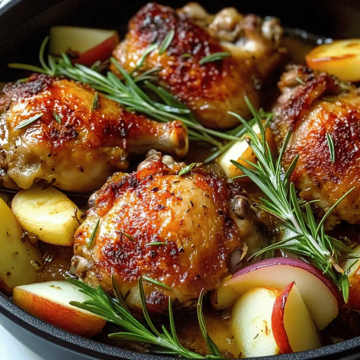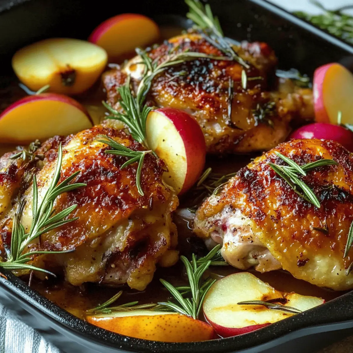 As the leaves turn golden and the air becomes crisp, there’s nothing quite like the aroma of roasting chicken to fill your kitchen with warmth. Enter my Rosemary Apple Cider Chicken, a dish that promises to turn any dinner into a cozy celebration of fall flavors. With juicy chicken thighs nestled among sweet Honeycrisp apples and fragrant fresh herbs, this easy recipe transforms simple ingredients into a comforting meal that the whole family will adore. It’s quick to prepare yet feels like a grand culinary gesture—perfect for those chilly evenings when you crave something heartwarming and delightful. Whether served alongside fluffy mashed potatoes or a simple green salad, the rich apple cider sauce will make each bite a memorable experience. Ready to embrace the essence of autumn? Let’s dive into this delicious recipe that’s sure to become a staple in your home! Why Is This Dish So Irresistible? Comforting Warmth: The flavors of rosemary and apple cider create a heartwarming dish that embodies fall, making it perfect for family gatherings. Easy to Prepare: With just a few simple steps, you’ll have a show-stopping meal ready without the fuss. Savory and Sweet: The combination of juicy chicken, sweet Honeycrisp apples, and aromatic herbs delivers a delightful balance of flavors that dance on your palate. Versatile Pairings: Serve with mashed potatoes or fluffy rice to soak up that rich sauce, making every bite satisfying. Crowd-Pleasing Appeal: This dish is sure to impress, becoming a favorite at your dinner table and a conversation starter with friends and family. Embrace cozy evenings with this Rosemary Apple Cider Chicken, and if you’re exploring more comforting meals, check out my Cheesy Chicken Spinach and Cheesy Chicken Broccoli recipes! Rosemary Apple Cider Chicken Ingredients • Here’s everything you need to make this cozy dish! For the Chicken Bone-In Chicken Thighs – Provides rich flavor and juicy texture; substitute skinless thighs for a leaner option. Olive Oil – For cooking chicken; can replace with vegetable oil if desired. Salt, Pepper – For seasoning; adjust to taste. For the Seasoning Onion Powder – Adds depth to the seasoning; leave out if using fresh onions. Garlic Powder – Enhances overall savoriness; fresh garlic can be substituted (3 cloves). Smoked Paprika – Introduces a slightly smoky flavor; regular paprika can work for a milder taste. Fresh Thyme – Provides aromatic notes; can substitute with 1 tsp dried thyme. Fresh Rosemary – Main herb for flavoring the chicken; use 1 tsp dried rosemary if fresh is unavailable. For the Sauce Salted Butter – Adds richness to the sauce; unsalted butter can be used, just adjust salt levels. Apple Cider – Provides sweetness and acidity; substitute apple juice in a pinch, but avoid sugar. Chicken Broth/White Wine – Adds liquid and depth to the sauce; use vegetable broth for a lighter version. Dijon Mustard – Contributes acidity and flavor complexity; yellow mustard can work in a pinch. For the Sautéed Vegetables Red Onion – Adds sweetness and texture; yellow or white onions can be swapped. Honeycrisp Apples – Offers sweetness; any firm, sweet apple can replace them. Sweeten your evenings with this delightful Rosemary Apple Cider Chicken that serves as a warm embrace on chilly nights! Step‑by‑Step Instructions for Rosemary Apple Cider Chicken Step 1: Preheat the Oven Begin by preheating your oven to 400°F (200°C). This initial step is crucial for achieving that perfect roast in your Rosemary Apple Cider Chicken. Use this time to gather your ingredients and prepare your workstation, ensuring everything is ready for a smooth cooking experience. Step 2: Season the Chicken In a large mixing bowl, generously season the bone-in chicken thighs with onion powder, garlic powder, smoked paprika, thyme, rosemary, salt, and pepper. Ensure each piece is thoroughly coated with the marinade, allowing the flavors to penetrate. This layer of seasoning is essential for enhancing the savory profile of your dish. Step 3: Sear the Chicken Heat a large, oven-safe skillet over medium-high heat and add a splash of olive oil. Once the oil is shimmering, carefully place the seasoned chicken thighs skin-side down into the skillet. Sear them for about 5-7 minutes or until the skin is golden and crispy. This step locks in moisture and creates a beautiful crust, perfect for your Rosemary Apple Cider Chicken. Step 4: Add Onions and Apples Once the chicken is beautifully seared, flip them over gently. Add thinly sliced red onions and Honeycrisp apples around the chicken in the skillet. These sweet additions will caramelize and mingle with the juices, enhancing the overall flavor profile of the dish. Step 5: Roast in the Oven Transfer the skillet to your preheated oven and roast the chicken for 25-30 minutes. Use a meat thermometer to check for doneness; the internal temperature should reach 165°F (74°C). During this time, the chicken will cook through while absorbing all the sweet and savory flavors. Step 6: Prepare the Sauce Once the chicken is fully cooked, remove it from the skillet and set it aside. On the stovetop, reduce the heat to medium-low and whisk in salted butter, apple cider, chicken broth (or white wine), garlic, and Dijon mustard. This combination will create a rich sauce that beautifully complements your Rosemary Apple Cider Chicken. Step 7: Thicken the Sauce Allow the sauce to simmer for 5-10 minutes, stirring occasionally until it thickens slightly. Keep an eye on it to ensure it doesn’t reduce too much; a thicker sauce will cling perfectly to the chicken and sides, enhancing every bite with its rich flavor. Step 8: Serve and Enjoy Once thickened, drape the luscious sauce over the warm chicken thighs before serving. Ensure to include the sautéed onions and apples on the plate as well; they add both texture and a burst of sweetness. Your Rosemary Apple Cider Chicken is now ready to delight yo