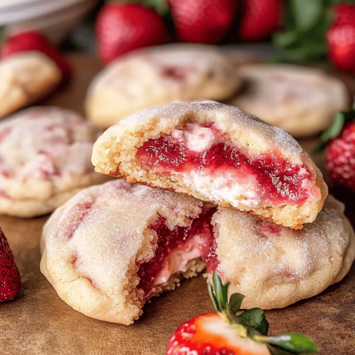 Jump to Recipe Print RecipeAs I licked the spoon, the vibrant pink swirl of homemade strawberry jam caught my eye, a nostalgic treat that transported me back to sun-filled summers and picnics in the park. Today, I’m excited to share my recipe for Soft Strawberry Cheesecake Cookies, a delightful fusion of chewy cookie goodness and a creamy cheesecake filling that’s simply irresistible. With a quick prep time and a fun twist on classic flavors, these cookies are perfect for a gathering or just an afternoon snack. Whether you’re a seasoned home-chef or a novice, these cookies will impress and satisfy your sweet tooth. Ready to indulge in this dreamy dessert? Let’s dive into the deliciousness! Why Are These Cookies So Irresistible? Soft and Chewy: Each cookie boasts a delightful texture that’s perfectly chewy, providing a satisfying bite that pairs beautifully with the creamy filling. Bursts of Flavor: The combination of homemade strawberry jam and rich vanilla cream cheese makes every bite a flavor explosion, reminiscent of a classic dessert. Easy to Make: With simple ingredients and straightforward instructions, even novice bakers can whip up these treats without a hitch. Perfect for Sharing: Whether at a potluck or a family gathering, these cookies are sure to impress guests and satisfy sweet cravings across the board. Versatile Variations: Try different berries or add crushed graham crackers for a fun twist, allowing you to customize based on your preferences! Indulge further in your dessert adventures with my other delightful recipes, like Lemon Sugar Cookies that offer a tangy zest or Fudgy Cookies & Cream Brownies that are a chocolate lover’s dream. Strawberry Cheesecake Cookies Ingredients For the Cheesecake Filling Cream Cheese – Use cold cream cheese for optimal fluffiness in your cheesecake filling. Granulated White Sugar – This sweetener brings out the best flavors in both the filling and the cookie dough. Vanilla Extract – Adds a rich flavor to enhance the creamy cheesecake filling. For the Strawberry Jam Fresh Strawberries – They provide a burst of fresh flavor; feel free to substitute with other berries if desired. Sugar – This sweetens the jam and helps it thicken as you cook the strawberries. For the Cookie Dough All-Purpose Flour – A main structure component; spoon and level the flour for accurate measurements. Baking Powder & Baking Soda – These leavening agents help achieve that perfect texture and lightness. Salt – Enhances the sweetness and overall flavor of the cookies. Unsalted Butter – Make sure it’s very softened to create a light and fluffy dough. Egg – Binds all ingredients together and contributes to the cookie texture. For Rolling the Cookies Sugar for Rolling – Used to roll the cookie dough, adding extra sweetness and a delightful crunch. Get ready to bake these heavenly Strawberry Cheesecake Cookies that’ll melt in your mouth with every bite! Step‑by‑Step Instructions for Strawberry Cheesecake Cookies Step 1: Prepare Cheesecake Filling Start by beating cold cream cheese with granulated sugar and vanilla extract in a mixing bowl until the mixture is light and fluffy, which takes about 3–5 minutes. Scoop the cheesecake mixture into small portions, approximately 1 tablespoon each, and place them on a baking sheet lined with parchment paper. Freeze these portions for at least 1 hour, or until solid, to ensure a perfectly creamy filling in your Strawberry Cheesecake Cookies. Step 2: Make Strawberry Jam While the cheesecake filling is freezing, prepare the homemade strawberry jam. In a medium saucepan over medium heat, combine diced fresh strawberries and sugar, cooking for about 10–15 minutes. Stir frequently until the mixture thickens and reduces; it should coat the back of a spoon. Once ready, transfer to a bowl and allow it to cool to room temperature before chilling in the refrigerator for a few minutes. Step 3: Cookie Dough Preparation Preheat your oven to 350°F (175°C) and line baking sheets with parchment paper. In a large bowl, whisk together all-purpose flour, baking powder, baking soda, and salt until thoroughly combined. In another bowl, cream softened unsalted butter with granulated sugar for about 4–5 minutes until the mixture is light and fluffy. Add in the egg and vanilla extract, mixing until the dough is pale and well combined. Step 4: Combine Ingredients Gradually add the dry ingredient mixture to the wet ingredients, using a spatula to mix until just combined. Be careful not to overmix! Gently fold in dollops of the cooled strawberry jam for a delicious marbled effect, ensuring you maintain some pockets of jam for flavor in each Strawberry Cheesecake Cookie. The dough should be thick but cohesive. Step 5: Form Cookies Using a cookie scoop or tablespoon, portion out the cookie dough and flatten each piece slightly in your palm. Place a frozen cheesecake filling portion in the middle of each dough piece and fold the dough around it, pinching to seal. Roll the filled dough in sugar for added sweetness and texture, ensuring the filling is completely encased, and shape into discs. Step 6: Bake Cookies Arrange the filled cookies on your prepared baking sheets, spacing them about 2 inches apart. Bake in the preheated oven for 11–12 minutes, or until the edges are lightly golden. The centers will look slightly soft but will firm up as they cool. After baking, let the cookies sit on the sheets for 5 minutes before transferring them to a wire rack to cool completely. This step helps set the lovely cheesecake filling in your Strawberry Cheesecake Cookies. How to Store and Freeze Strawberry Cheesecake Cookies Room Temperature: Store cookies in an airtight container for up to 3 days to maintain their freshness and chewy texture. Fridge: For longer-lasting cookies, keep them in the fridge in an airtight container, where they’ll stay good for up to 1 week while maintaining their delicious flavor. Freezer: Fr
