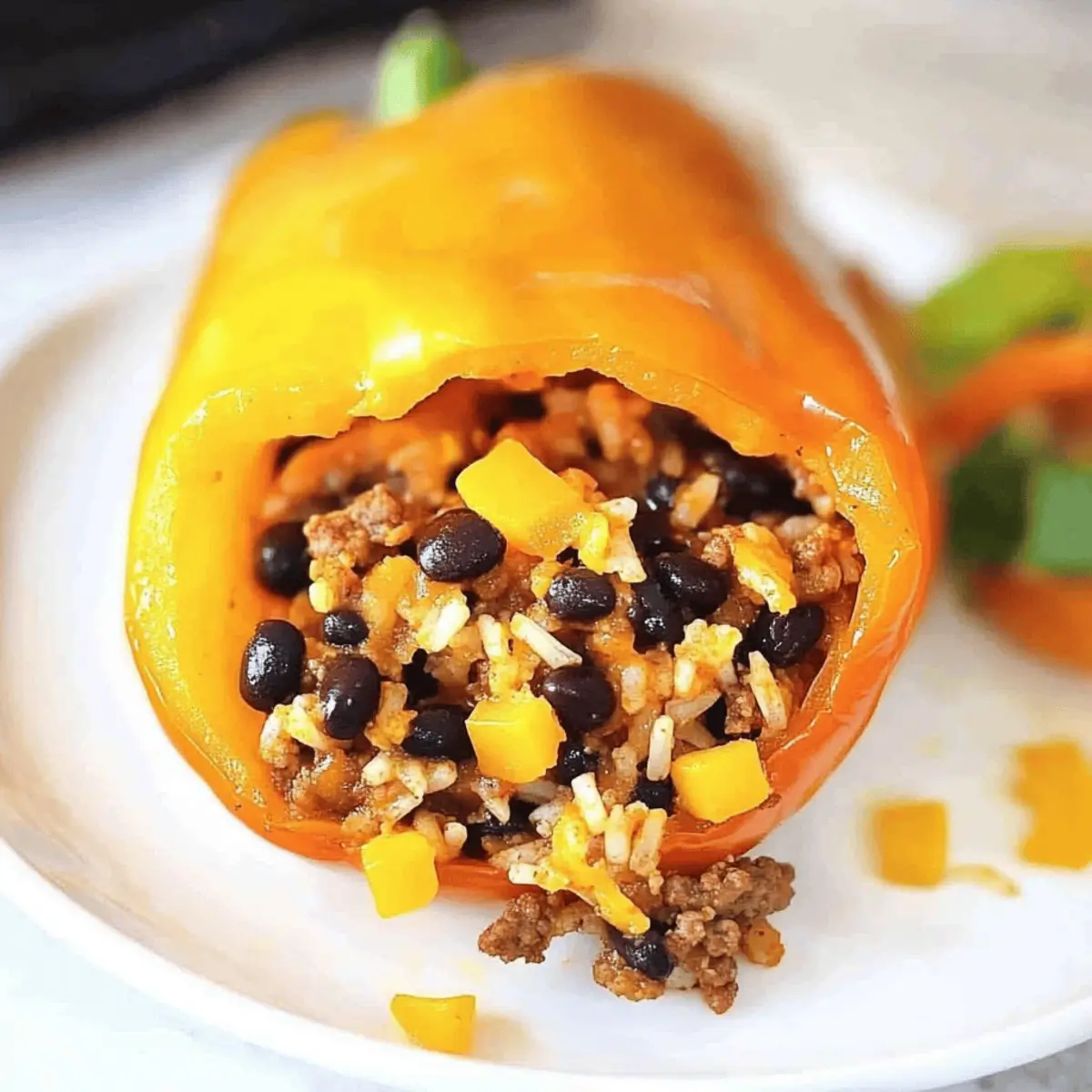 As I chopped vibrant bell peppers one evening, a wave of nostalgia washed over me, taking me back to family dinners filled with laughter and flavor. This recipe for Stuffed Peppers with Ground Beef not only brings that warm coziness to your table, but it also whips up in no time—perfect for those busy weeknights when you crave something delicious without the fuss. The best part? With endless customization options, you can easily tailor this dish to your family’s tastes or dietary needs, making it a great option for everyone around the dinner table. Whether you choose to use ground turkey or sneak in some extra vegetables, these stuffed peppers are a delightful reminder that homemade comfort food can be both quick and healthy. Ready to elevate your weeknight meals? Let’s dive into this savory adventure together! Why Are Stuffed Peppers So Loved? Quick to Make: These stuffed peppers can go from kitchen to table in just 30 minutes. Perfect for busy weeknights! Flavor Explosion: The combination of seasoned ground beef, melted cheese, and vibrant veggies creates a mouthwatering taste that the whole family will enjoy. Versatile Options: Customize your dish by swapping in ground turkey or adding your favorite vegetables for a nutritious twist. Healthy Comfort: Packed with protein and fiber, this dish satisfies your craving for comfort food without the guilt. A Family Tradition: Each bite can transport you back to cherished family gatherings, making meals feel special again—just like our Sausage Stuffed Jalapenos do! Stuffed Peppers Ingredients For the Peppers • Bell Peppers – The foundation of your dish, choose vibrant colors for a visual and flavorful punch. For the Filling • Ground Beef – A rich protein source; swap for ground turkey for a lighter dish. • Cooked Rice – Adds bulk; consider cauliflower rice for a low-carb alternative. • Can of Corn – Offers a touch of sweetness; fresh corn is delightful when in season. • Can of Rotel Diced Tomatoes and Green Chilis – Brings moisture and a kick; select mild or hot based on preference. • Can of Black Beans – Boosts fiber and protein; can be omitted for a lower carb meal. • Small Onion (diced) – Enhances overall flavor; shallots work well as a substitute. • Minced Garlic – Infuses aromatic depth; garlic powder can be used if on hand. For the Seasoning • Chili Powder – Adds heat and warmth; adjust to match your taste. • Oregano – Introduces a fragrant herbal note; fresh herbs make a lovely substitution. • Cumin – Delivers earthy flavor; feel free to leave it out if it’s not to your liking. • Salt – Essential for enhancing flavors; low-sodium options are available for health. • Pinch of Cayenne – Optional for added heat; omit for milder stuffed peppers. For the Topping • Shredded Cheese – Binds and enhances flavor; try Monterey Jack or Pepper Jack for variety. Step‑by‑Step Instructions for Stuffed Peppers Step 1: Preheat the Oven Begin by preheating your oven to 350°F (175°C). This is essential for ensuring that your Stuffed Peppers bake evenly and develop a nice, tender texture. While the oven heats, you can prepare your filling ingredients, allowing for a seamless cooking experience. Step 2: Brown the Ground Beef In a large skillet over medium-high heat, add your ground beef and cook for about 7-8 minutes, stirring often until it’s fully browned and no longer pink. Drain any excess grease to prevent a greasy texture in your Stuffed Peppers. Look for a nicely browned color to indicate readiness. Step 3: Sauté the Vegetables Add the diced onion to the skillet and sauté for 5 minutes until it becomes translucent and soft. Next, stir in the minced garlic and cook for an additional minute, infusing the filling with aromatic depth. You’ll know it’s ready when the garlic becomes fragrant and lightly golden. Step 4: Combine Filling Ingredients Stir in the can of corn, Rotel diced tomatoes and green chilis, black beans, and cooked rice into the meat mixture. Mix in the chili powder, oregano, cumin, salt, and cayenne, ensuring everything is well combined. Heat through until everything is warmed, then remove from the heat source. Step 5: Prepare the Bell Peppers While the filling cools slightly, prepare the bell peppers by cutting off the tops and removing the seeds. For easier stuffing, microwave the peppers for 2-3 minutes until they are slightly softened. This technique helps to ensure your Stuffed Peppers cook evenly in the oven. Step 6: Fill the Peppers Spoon the beef mixture generously into each bell pepper, being careful not to overstuff them. Leave a little space at the top to allow for expansion during baking. Once filled, sprinkle shredded cheese on top of each stuffed bell pepper for that gooey, flavorful finish. Step 7: Bake the Stuffed Peppers Place the stuffed peppers upright in a baking dish and bake uncovered for 20-25 minutes. The peppers should become tender and the cheese melted and bubbly. Look for a slight browning on the cheese as a sign that your Stuffed Peppers are ready to serve. How to Store and Freeze Stuffed Peppers Fridge: Store cooked stuffed peppers in an airtight container for up to 3 days. Reheat in the microwave or oven, ensuring they’re heated through to enjoy at your convenience. Freezer: For longer storage, freeze cooked stuffed peppers wrapped tightly in plastic wrap and aluminum foil for up to 3 months. Thaw in the refrigerator before reheating. Reheating: To reheat, place thawed stuffed peppers in a baking dish, cover with foil, and warm in a preheated oven at 350°F (175°C) for about 20 minutes until heated through. Make Ahead: Stuffed peppers can be prepared in advance and refrigerated before baking. Just take them out and bake straight from the fridge when ready to serve. Make Ahead Options These Stuffed Peppers with Ground Beef are perfect for meal prep enthusiasts! You can prepare the filling up to 3 days in advance and store it in 