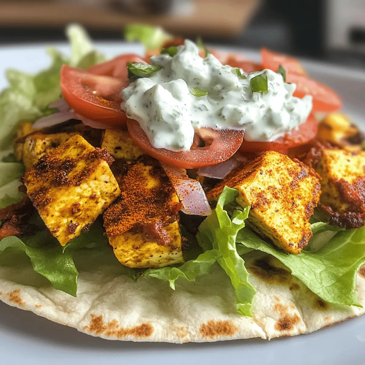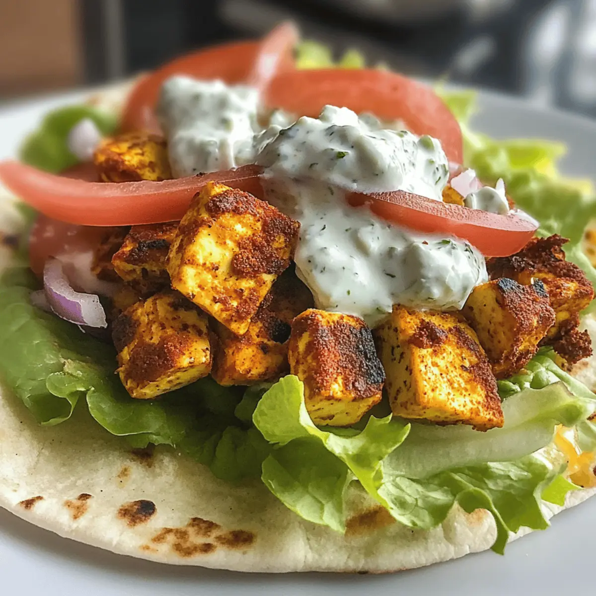 Jump to Recipe Print RecipeThe aroma wafts through the kitchen, pulling me back to a bustling street market where shawarma is not just a meal, but an experience. This Quick and Easy Tofu Shawarma captures that spirit and brings it home for everyone to enjoy. As a high-protein vegan delight, it not only caters to plant-based diets but also serves up convenience—ready in just 25 minutes! Whether you’re racing against the clock for lunch or prepping for a week of healthy meals, this dish is your ticket to flavor without the fuss. With its crispy tofu and zesty homemade tzatziki, you’ll find a satisfying balance that makes every bite feel like a celebration. Are you curious about how this vibrant, wholesome wrap comes together? Let’s dive in! Why is Tofu Shawarma a Must-Try? Simplicity: This recipe is straightforward, making it ideal for both novice cooks and seasoned chefs. Quick Preparation: In just 25 minutes, you’ll have a satisfying meal ready to enjoy—perfect for busy weekday lunches or meal prep. High-Protein: With 25 grams of protein per serving, it’s a great option for those looking to nourish their bodies without sacrificing taste. Flavor Explosion: The aromatic shawarma spices combined with the crispy tofu deliver a taste sensation that will impress everyone! Versatile Dish: Enjoy it wrapped in flatbreads, in salads, or even over quinoa for a delightful twist—there’s truly no wrong way to serve it! Get ready to elevate your meals with this delicious and nutritious Tofu Shawarma! Tofu Shawarma Ingredients • Dive into the hearty flavors of Tofu Shawarma with these easy-to-find ingredients! For the Flatbreads Flatbreads – The perfect wrap for all your delightful fillings; opt for gluten-free wraps if needed. For the Salad Little Gem Lettuce – Adds a refreshing crunch; any leafy greens can substitute for extra freshness. Tomatoes – Choose large or cherry varieties for juiciness; bell peppers can also add a sweet twist. Cucumber – This veggie serves up a delightful crunch; zucchini can take its place if you’re out of cucumber. For the Dip Homemade Tzatziki – Creamy and tangy, it enhances the shawarma beautifully; use yogurt for a milder flavor. For the Tofu Extra-Firm Tofu – The star of your dish, delivering hearty texture; avoid silken tofu for this recipe. Olive Oil – Brings moisture to the marinade; avocado oil is a perfect replacement if you prefer. Lemon Juice – Adds brightness and a lovely acidity; vinegar (white or apple cider) works well too. Honey – Balances the flavors with a hint of sweetness; substitute with maple syrup for a fully vegan option. Shawarma Spice Mix – The magical mix (Cumin, Smoked Paprika, Turmeric, Oregano, Cayenne, Salt, Black Pepper, Ground Ginger) defines this dish; pre-made shawarma seasoning offers convenience too! Garlic (minced) – Infuses depth and aroma; garlic powder is a quick alternative if needed. Corn Flour – Helps crisp the tofu for that perfect texture; any regular or gluten-free flour will do. For the Crisp Corn Flour – Aids in achieving the ideal crispiness for baked tofu; regular flour or gluten-free blends can also work as substitutes. Step‑by‑Step Instructions for Tofu Shawarma Step 1: Prepare the Tofu Begin by patting the extra-firm tofu dry with paper towels to remove excess moisture; this is essential for achieving crispy edges. If needed, gently squeeze the tofu to help further release water. Once dried, slice the tofu into thin pieces using a box grater or a sharp knife, ensuring uniform thickness for even cooking. Step 2: Arrange on a Baking Sheet Lay the sliced tofu pieces flat on a baking sheet lined with parchment paper, making sure they do not overlap. This will allow each piece to bake evenly and achieve that desired crispness. Preheat your oven to 180°C (356°F) while you prepare the marinade, setting the stage for a flavorful Tofu Shawarma. Step 3: Mix the Shawarma Marinade In a mixing bowl, combine olive oil, lemon juice, honey, and your shawarma spice mix (cumin, smoked paprika, turmeric, oregano, cayenne, salt, black pepper, ground ginger). Stir well until fully blended. If the mixture appears too thick, add a little water to adjust the consistency. This marinade will infuse your tofu with the vibrant flavors characteristic of traditional shawarma. Step 4: Coat the Tofu Slices Using tongs or your hands, carefully coat each tofu slice with the prepared shawarma marinade, ensuring all sides are well-covered. This step is crucial as the marinade will not only add flavor but also help the tofu crisp up nicely in the oven. Allow the coated tofu to sit for a few moments to soak up the spices. Step 5: Bake the Tofu Spread the marinated tofu slices evenly on the baking sheet, making sure they are not crowded. Bake in the preheated oven for 15-20 minutes, flipping halfway through to ensure even browning. You’ll know the tofu is done when the edges are crispy and golden brown, giving you that perfect texture for your Tofu Shawarma. Step 6: Assemble Your Shawarma Once the tofu is beautifully baked, it’s time to assemble your Tofu Shawarma! Lay out your flatbreads and layer in the crunchy little gem lettuce, sliced tomatoes, cucumbers, and the crispy tofu. Finally, drizzle with homemade tzatziki for a refreshing touch. Step 7: Serve and Enjoy Wrap the flatbreads around your delicious fillings or serve them open-faced for easy enjoyment. Your Tofu Shawarma is now ready to be devoured! Whether serving it fresh from the oven or allowing it to cool for meal prep, this dish offers a delightful, healthful experience that’s sure to impress. Tofu Shawarma Variations & Substitutions Feel free to get creative and make this Tofu Shawarma your own with these delightful twists! Tempeh Swap: Replace tofu with tempeh for a nuttier texture and flavor that pairs beautifully with the spices. Grilled Veggies: For a smoky twist, grill your salad veggies instead of using them fresh. This adds a r