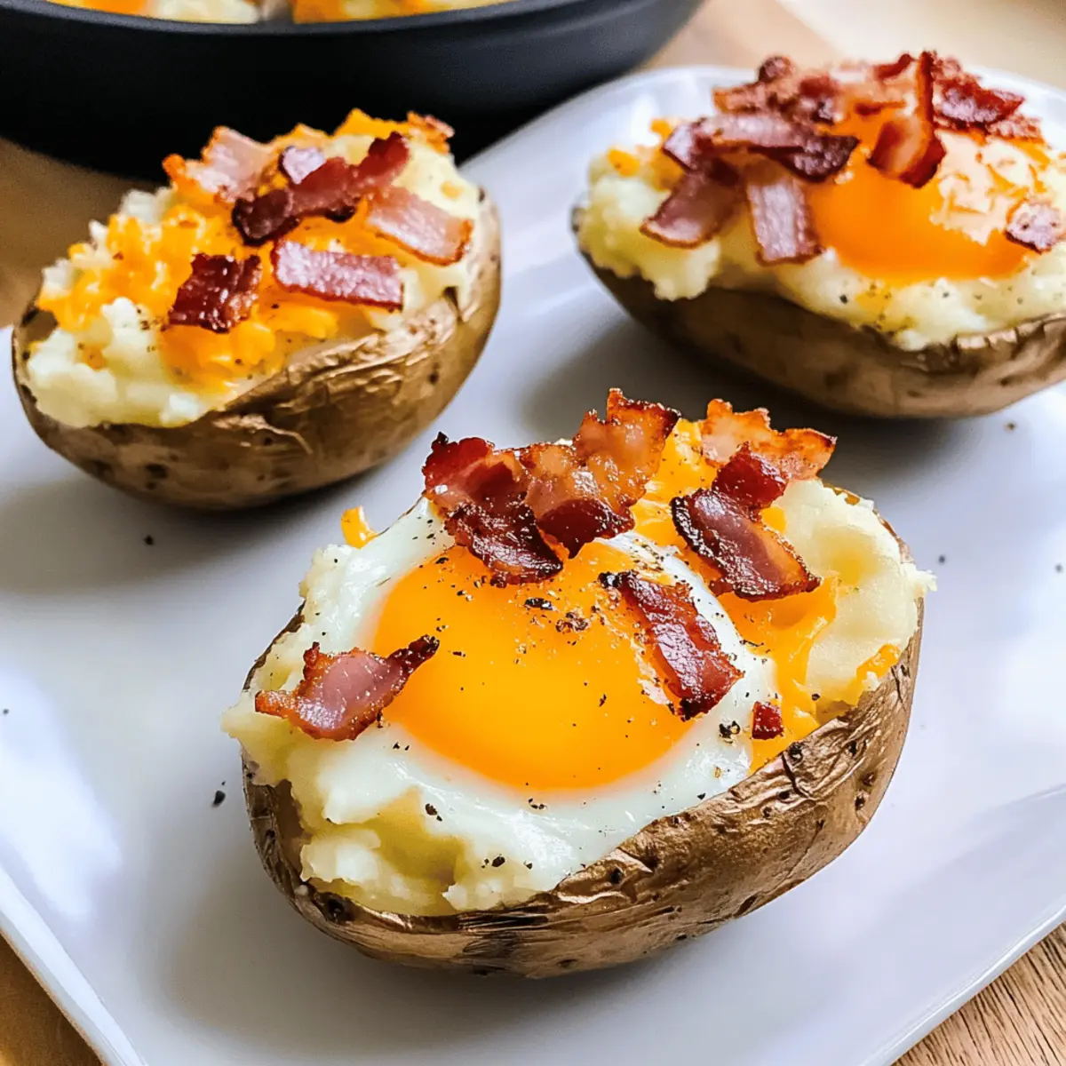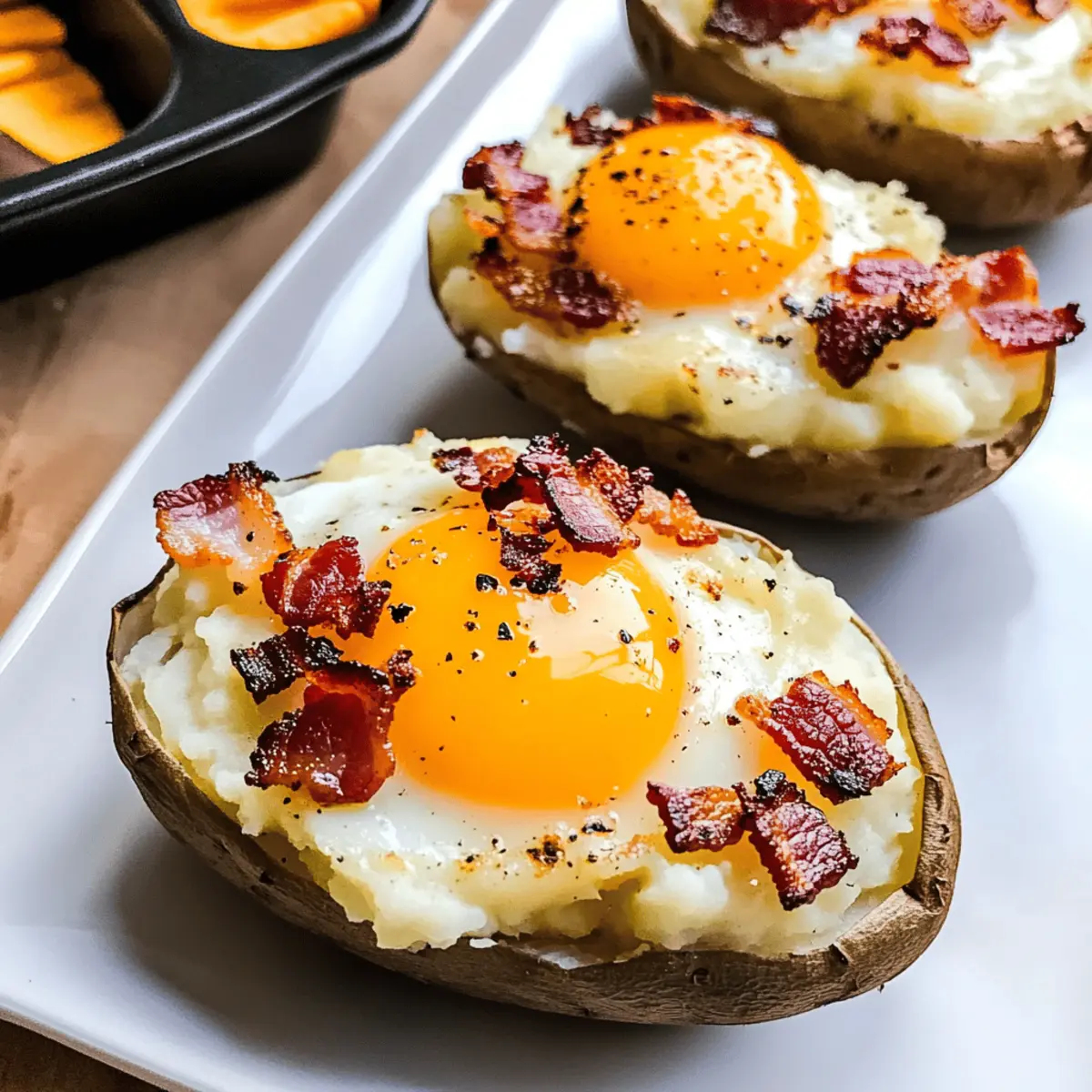 Jump to Recipe Print RecipeAs I sat savoring the final bits of my breakfast under the warm morning light, I couldn’t help but think about how these Twice Baked Loaded Breakfast Potatoes have transformed my weekend brunches. Soft, fluffy russet potatoes embrace a rich mashed filling that’s complemented by melty cheddar and smoky beef bacon, all crowned with a perfectly baked egg. Not only are these potatoes gluten-free, but they also make for an excellent meal-prep option, allowing busy mornings to still be absolutely delicious. Whether you’re entertaining friends or preparing for a cozy family gathering, this hearty dish checks all the boxes for comfort, flavor, and sheer enjoyment. Ready to discover how to make this delightful treat? Let’s dive in! Why Are Twice Baked Potatoes So Irresistible? Comforting Flavors: Each bite of these Twice Baked Loaded Breakfast Potatoes combines the comforting taste of fluffy russet potatoes with a creamy, cheesy filling that warms the soul. Crowd-Pleasing Delight: Perfect for family brunches or friends gathering, everyone will rave about this hearty dish! Versatile Ingredients: Use turkey bacon or swap cheeses like gouda for extra flavor, tailoring it to your family’s preferences. Time-Saving Meal Prep: Prepare the mashed filling ahead of time for quick assembly, making busy mornings a breeze without sacrificing taste. Gluten-Free Goodness: Enjoy these delicious potatoes knowing they cater to various dietary needs, ensuring everyone at the table can indulge! Pair these with a side of Baked Garlic Parmesan for a balanced brunch experience. Twice Baked Loaded Breakfast Potatoes Ingredients Dive into the world of savory goodness with these delightful Twice Baked Loaded Breakfast Potatoes! For the Potatoes • Large Russet Potatoes – Ideal for a fluffy interior and crispy skin; ensure they’re big enough to hold an egg. • Avocado Oil – Adds flavor and helps achieve a golden crust; olive oil is a suitable alternative. • Salt and Black Pepper – Essential seasonings that enhance the overall flavor; adjust according to personal taste. For the Filling • Unsalted Butter – Imparts rich creaminess to the mashed potatoes; can be replaced by plant-based butter for a vegan treat. • Hot Milk – Creates a velvety texture in the filling; non-dairy milk can offer a lactose-free option. • Beef Bacon – Provides a delicious smoky flavor; try turkey bacon or sausage to suit different dietary preferences. • Shredded Cheddar Cheese – Melts beautifully, enriching the filling; experiment with gouda or mozzarella for a unique twist. For Topping • Large Eggs – A key ingredient baked right in the potato, adding protein; adjust baking time based on yolk doneness preference. Prepare to enjoy these Twice Baked Loaded Breakfast Potatoes that are not only scrumptious but also gluten-free, ensuring everyone can partake in this indulgent start to the day! Step‑by‑Step Instructions for Twice Baked Loaded Breakfast Potatoes Step 1: Preparation Preheat your oven to 400°F (200°C). Wash the large russet potatoes thoroughly to remove any dirt, then poke several holes in each potato with a fork to allow steam to escape during baking. Coat the skins with a drizzle of avocado oil, and sprinkle generously with salt and black pepper. Place the potatoes directly on the oven rack and bake for 50-60 minutes, until they are fork-tender and the skins are crispy. Step 2: Cooling & Scooping Once the potatoes are done baking, remove them from the oven and let them cool for about 10 minutes. Gently cut each potato in half lengthwise, and using a spoon, carefully scoop out the insides, leaving a thin layer of potato attached to the skin to retain structure. This step is crucial for your Twice Baked Loaded Breakfast Potatoes to hold their shape. Step 3: Mashed Potato Filling In a mixing bowl, combine the scooped potato flesh with hot milk, unsalted butter, and season with salt and black pepper. Use a potato masher or a hand mixer to blend everything until it’s creamy and smooth. The warm milk helps create a delicious, velvety texture in the filling. Taste and adjust seasoning as needed before proceeding to the next step. Step 4: Filling the Shells Spoon the creamy mashed potato filling back into each potato shell, creating a little well in the center. Sprinkle evenly with crispy beef bacon and shredded cheddar cheese. To make these Twice Baked Loaded Breakfast Potatoes truly special, crack a large egg into the well of each potato half. Be mindful to keep the yolks intact for a delightful runny center when baked. Step 5: Final Bake Lower the oven temperature to 375°F (190°C) and place the filled potatoes back on the oven rack. Bake for an additional 15-20 minutes, or until the egg whites are set, while the yolks can remain runny if desired. Keep an eye on them, as you’ll want the potatoes to be hot and the cheese bubbly—a glorious sight! Step 6: Serving Remove the Twice Baked Loaded Breakfast Potatoes from the oven and let them cool for a few minutes to avoid burns. Serve warm, and if desired, garnish with fresh herbs or additional seasoning. These delightful, cheesy, and egg-topped potatoes are perfect for any hearty breakfast or brunch spread! Variations & Substitutions for Twice Baked Loaded Breakfast Potatoes Feel free to make this recipe your own by swapping ingredients or adding exciting elements! Dairy-Free: Use plant-based butter and non-dairy milk for a creamy filling without dairy. This alternative keeps the richness while catering to lactose sensitivities, ensuring everyone can enjoy this cozy dish. Turkey Bacon: Swap out beef bacon for turkey bacon to lighten the dish. You’ll still get that smoky flavor but with a healthier twist—perfect for those keeping an eye on their meat intake. Cheese Swaps: Experiment with cheeses like gouda or pepper jack for unique tastes. Gouda will bring a nutty, sweet essence, while pepper jack adds a zesty kick th